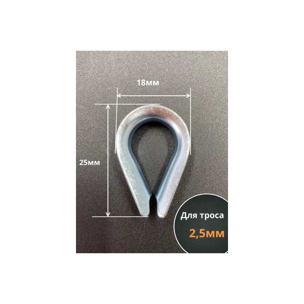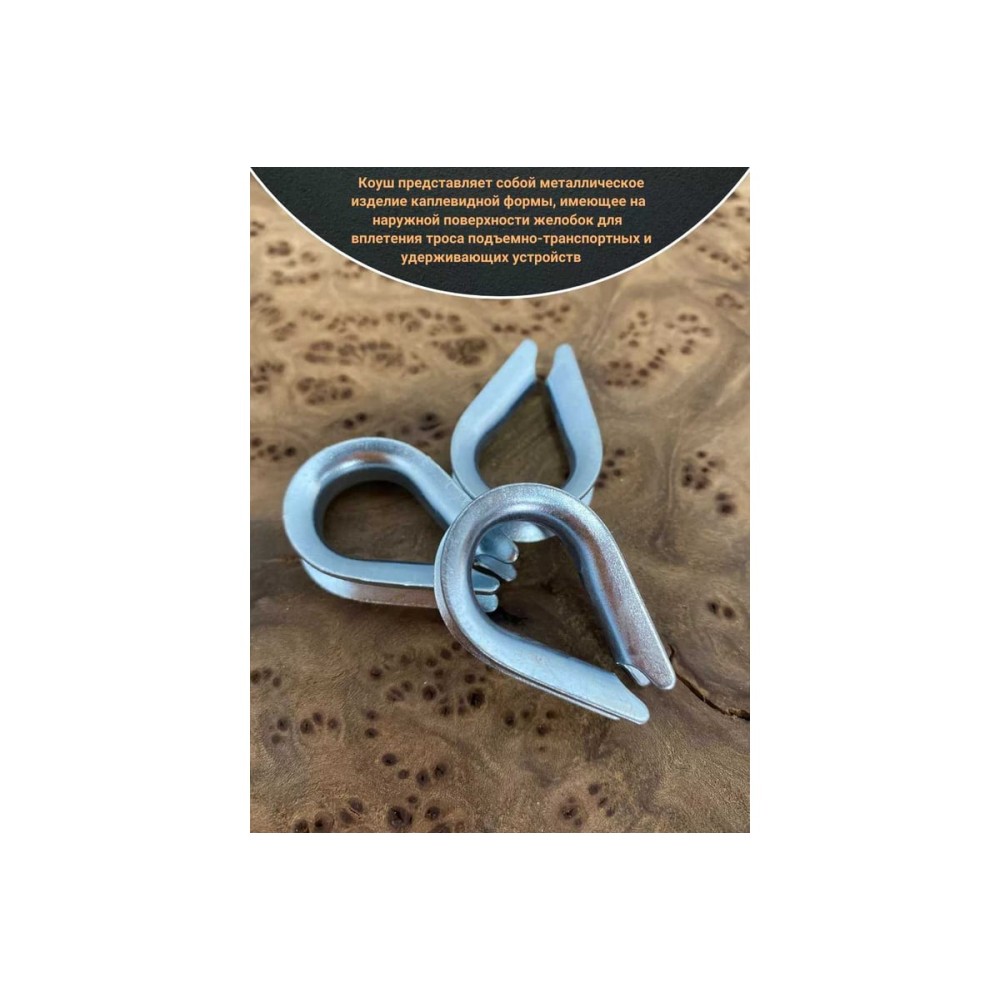 Коуш представляет собой металлическое изделие каплевидной формы, имеющее на наружной поверхности желобок для вплетения троса подъемно-транспортных и удерживающих устройств. Используются коуши для получения более плавной петли и последующего предотвращения истирания и излома каната (троса). Наиболее широкое применение коуши находят в грузоподъемных устройствах, используемых на строительных объектах, складах, производстве и промышленности. А также применяются в грузоподъемных системах, являются частью судового такелажа, служат для крепления канатов и тросов. Они могут быть установлены как на стальные, так и на синтетические канаты. Коуш стальной М3. Длина изделия 25мм. Подходит для троса диаметром 2,5мм.