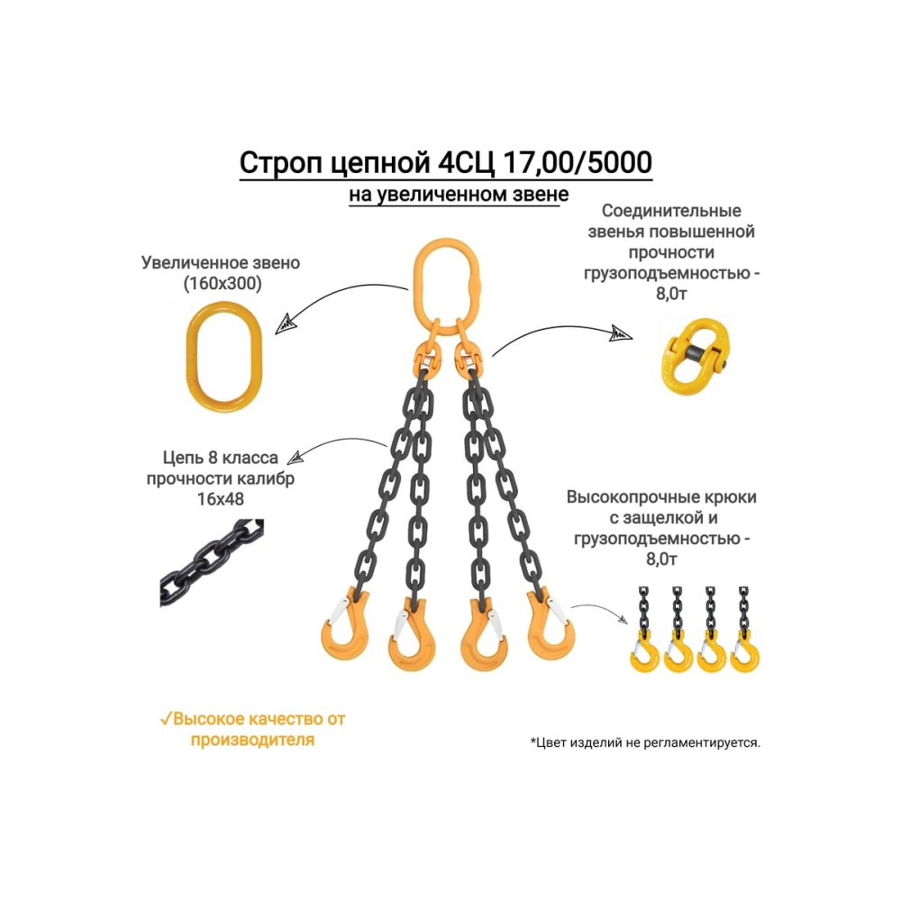 Цепной четырехветвевой строп КанТраст на увеличенном звене (160x300) 4СЦ 17,0/5000 мм 4STSUVZ175000 - универсальное такелажное приспособление, применяемое при грузоподъемных работах и изготавливается из легированной стали высокой прочности класса Т8. Коэффициент запаса прочности 4:1. Надежность и неприхотливость данного стропа позволяет применять его повсеместно, в таких сферах как строительство, металлургия, добывающие отрасли, станкостроительное производство, сельское хозяйство и мн. др.