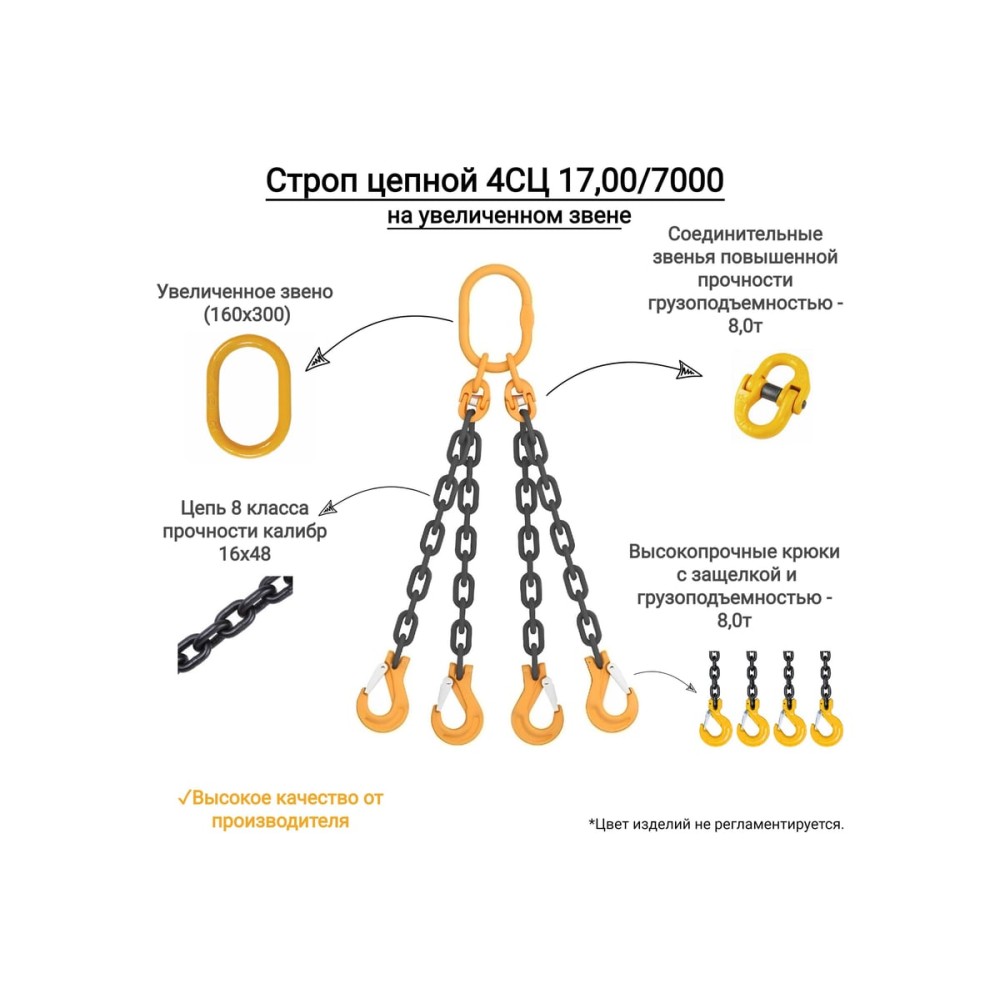 Цепной четырехветвевой строп КанТраст на увеличенном звене (160x300) 4СЦ 17,0/7000 мм 4STSUVZ177000 - универсальное такелажное приспособление, применяемое при грузоподъемных работах и изготавливается из легированной стали высокой прочности класса Т8. Коэффициент запаса прочности 4:1. Надежность и неприхотливость данного стропа позволяет применять его повсеместно, в таких сферах как строительство, металлургия, добывающие отрасли, станкостроительное производство, сельское хозяйство и мн. др.