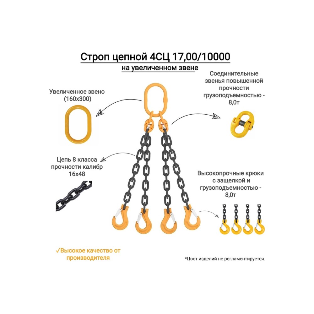 Тип цепной Грузоподъемность 17 т Материал сталь Длина 10 м Количество ветвей 4 шт Размер звена 16х48 мм ГОСТ/ТУ РД 10-33-93 Класс грузоподъемности 8 Крюки укоротители нет