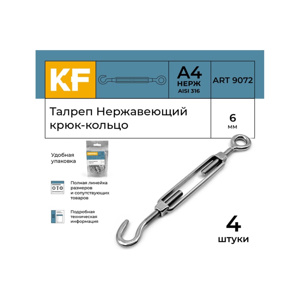 Нержавеющий талреп KREPFIELD М6, ART 9072, А4, крюк - кольцо, 4 шт. 9072СА4ТАЛРЕП6ММ-4