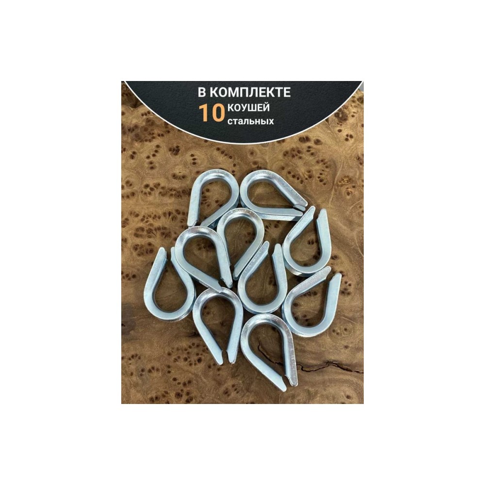 Коуш представляет собой металлическое изделие каплевидной формы, имеющее на наружной поверхности желобок для вплетения троса подъемно-транспортных и удерживающих устройств. Используются коуши для получения более плавной петли и последующего предотвращения истирания и излома каната (троса). Наиболее широкое применение коуши находят в грузоподъемных устройствах, используемых на строительных объектах, складах, производстве и промышленности. А также применяются в грузоподъемных системах, являются частью судового такелажа, служат для крепления канатов и тросов. Они могут быть установлены как на стальные, так и на синтетические канаты. Коуш стальной М4. Длина изделия 29мм. Подходит для троса диаметром 3,5мм.