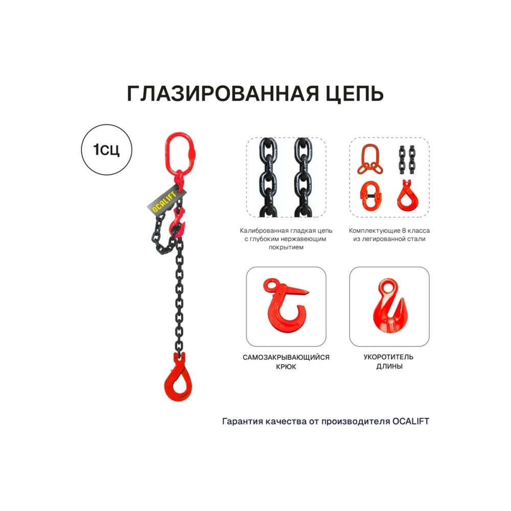 Цепной строп OCALIFT 1СЦ 8т 3,5м с самозакрывающимся крюком и укоротителем одноветвевой цепь глазированная 16x48 T8 G80 1sc8000t35shf