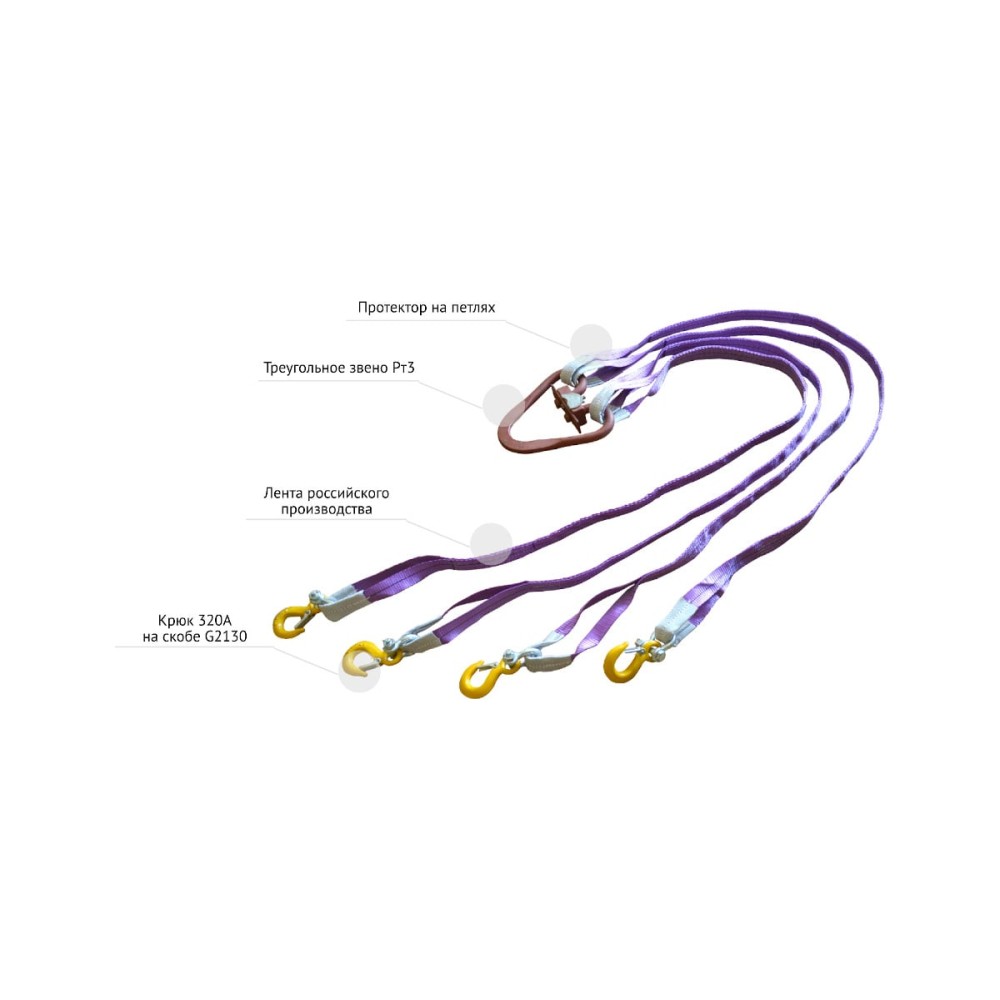 Четырехветвевые стропы, снабженные крюком или другим грузозахватным органом (тип 4СТ) применяют для захвата и транспортировки грузов в конструкции которых имеются монтажные приспособления - петли, проушины, скобы и т.д.