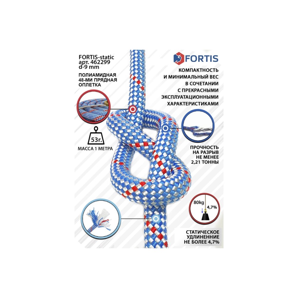 Высокопрочная 40 прядная веревка с оплёткой Fortis Static, диаметром 9 мм, разрывная нагрузка 21 кН. Предназначена для использования при подъеме, спуске или же страховке людей при выполнении работ промышленного альпинизма, скалолазании, строительстве, туризме и спелеологии. Так же Fortis Static хорошее решение для использования в быту или для организации активного отдыха на природе. Например, как фал для автомобиля, крепления и стяжки грузов, организаций веревочных лагерей или полос препятствий, навески качелей, тарзанок или организаций переправ на речках и т.п. ТР ТС019/221 Цвет и узор могут отличатся от представленного фото, в зависимости от партии.