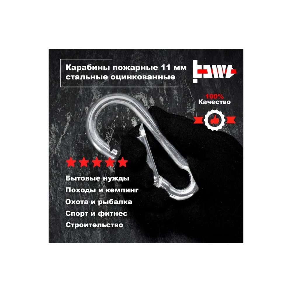 Карабин пожарный - это надежный и прочный крепежный элемент для использования в различных ситуациях. Он изготовлен из высококачественной углеродистой стали, что обеспечивает высокую прочность и долговечность. Кроме того, карабин имеет цинковое покрытие, которое защищает его от коррозии и повышает стойкость к внешним воздействиям. Пожарный карабин используется для быстрого и надежного крепления тросов, веревок и цепей между собой, а также для подвешивания инструментов и других предметов. Он может быть использован как карабин для сумок, ключей или в коляску, а также для поводка собак. Подходит для использования на даче, в гараже, мастерской, а также во время туризма, рыбалки и охоты. Он является необходимым элементом в любом туристическом наборе или в случае неответственных грузоперевозок. Кроме того, карабин имеет компактный размер и легкий вес, что делает его удобным для переноски и хранения. Он обладает высокой степенью надежности и безопасности, что делает его идеальным выбором для любых задач крепления и подвешивания.