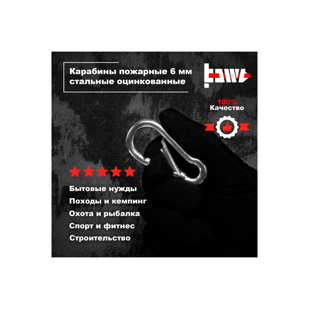 Карабин пожарный - это надежный и прочный крепежный элемент для использования в различных ситуациях. Он изготовлен из высококачественной углеродистой стали, что обеспечивает высокую прочность и долговечность. Кроме того, карабин имеет цинковое покрытие, которое защищает его от коррозии и повышает стойкость к внешним воздействиям. Пожарный карабин используется для быстрого и надежного крепления тросов, веревок и цепей между собой, а также для подвешивания инструментов и других предметов. Он может быть использован как карабин для сумок, ключей или в коляску, а также для поводка собак. Подходит для использования на даче, в гараже, мастерской, а также во время туризма, рыбалки и охоты. Он является необходимым элементом в любом туристическом наборе или в случае неответственных грузоперевозок. Кроме того, карабин имеет компактный размер и легкий вес, что делает его удобным для переноски и хранения. Он обладает высокой степенью надежности и безопасности, что делает его идеальным выбором для любых задач крепления и подвешивания.