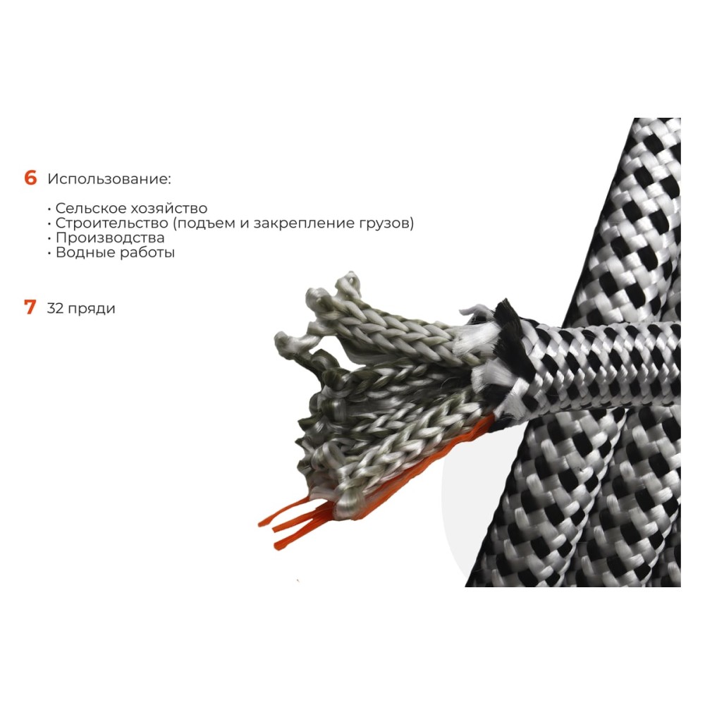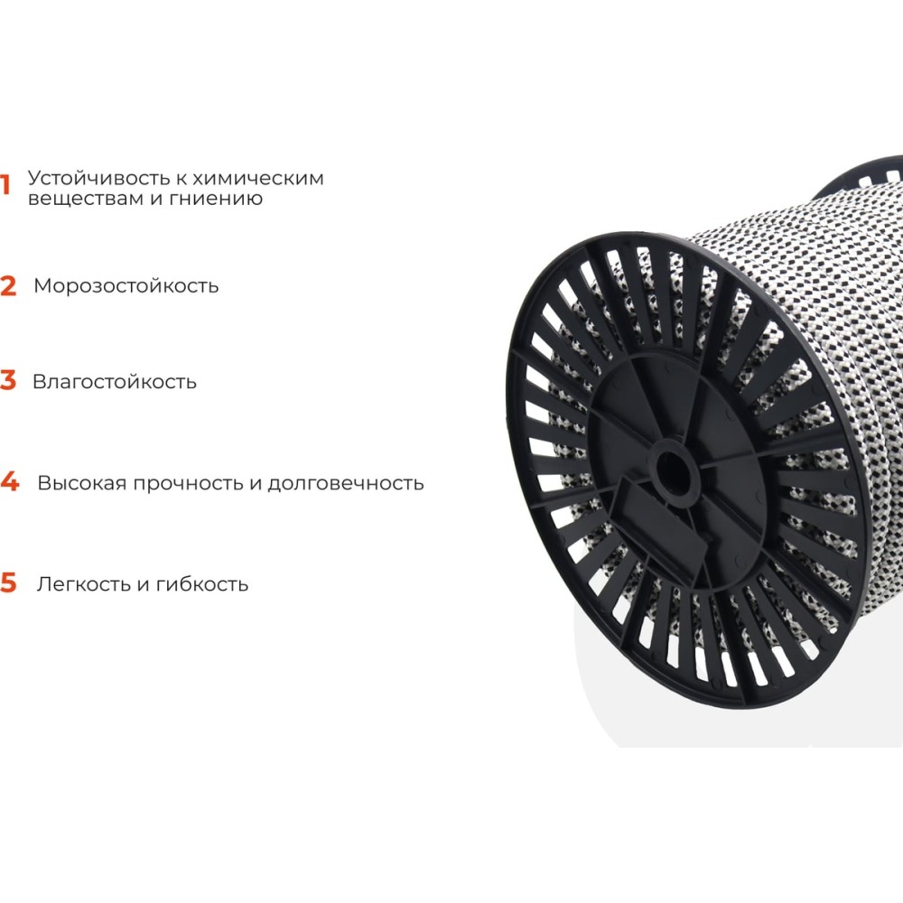 Подходит для транспортировки груза. Устойчива к многократным изгибам и не распускается при повреждении внешних нитей. Не впитывает воду, что делает ее незаменимой для использования в условиях повышенной влажности или на воде. Продукт устойчив к воздействию кислот, щелочей и выдерживает температуры до -70°C.