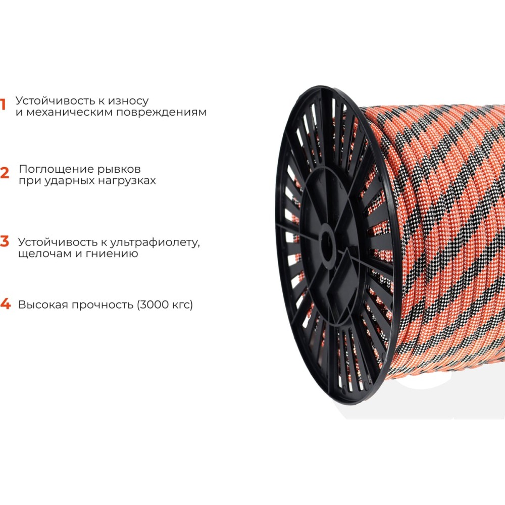 Веревка эффективно поглощает энергию рывков. Продукт отличается высокой износостойкостью к механическим повреждениям, воздействию ультрафиолета и влаги, что увеличивает её срок службы даже при эксплуатации в суровых климатических условиях. Внешнее покрытие веревки снижает трение и облегчает её использование на любых поверхностях и в разных системах такелажа.