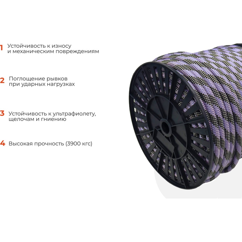Веревка эффективно поглощает энергию рывков. Продукт отличается высокой износостойкостью к механическим повреждениям, воздействию ультрафиолета и влаги, что увеличивает её срок службы даже при эксплуатации в суровых климатических условиях. Внешнее покрытие веревки снижает трение и облегчает её использование на любых поверхностях и в разных системах такелажа.