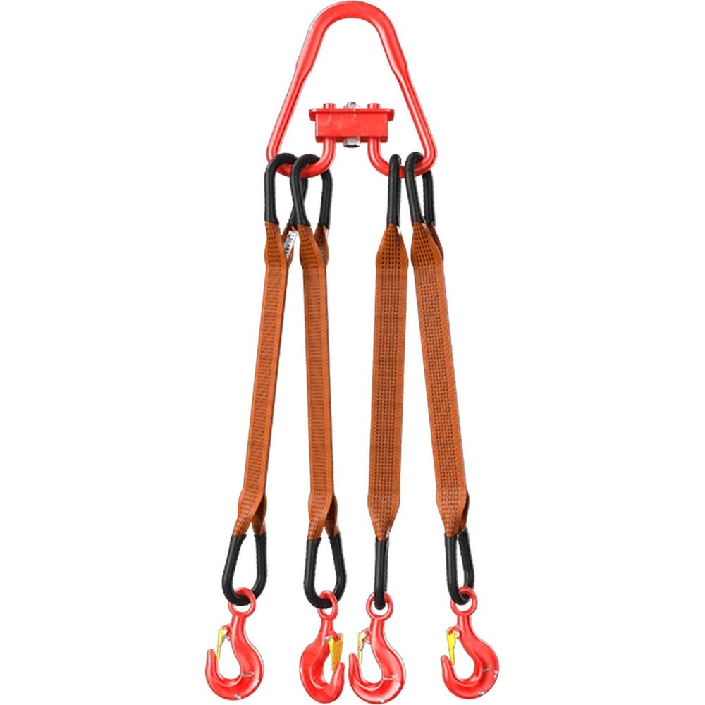 Строп текстильный четырехветвевой 4СТ изготавливается из плоской полиэстеровой ленты с петлевыми окончаниями (огонами) с использованием подъемного звена.