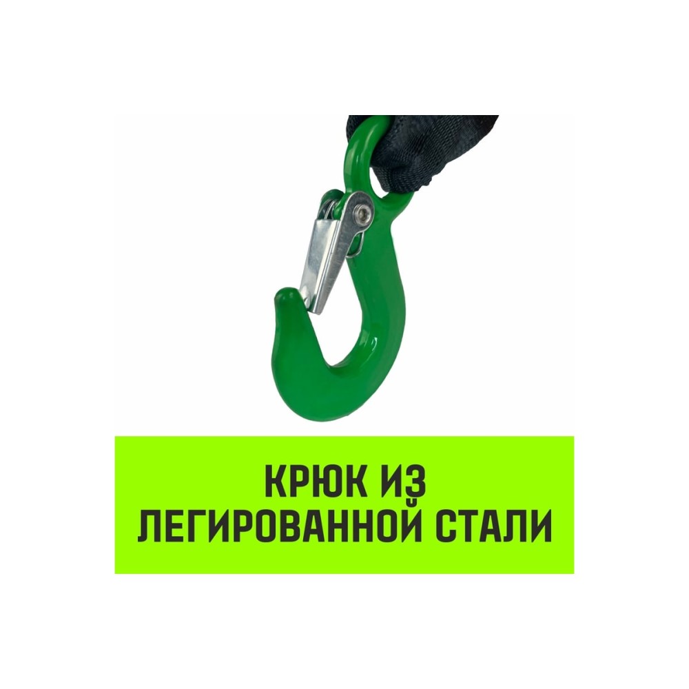 - Крюк из легированной стали имеет прочную защелку безопасности, что позволяет надежно закрепить груз.