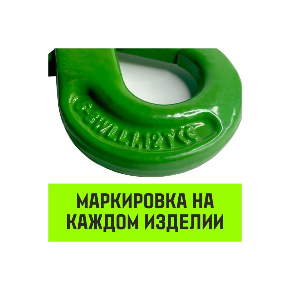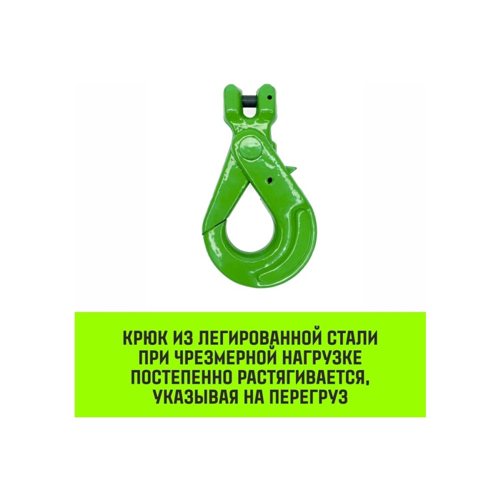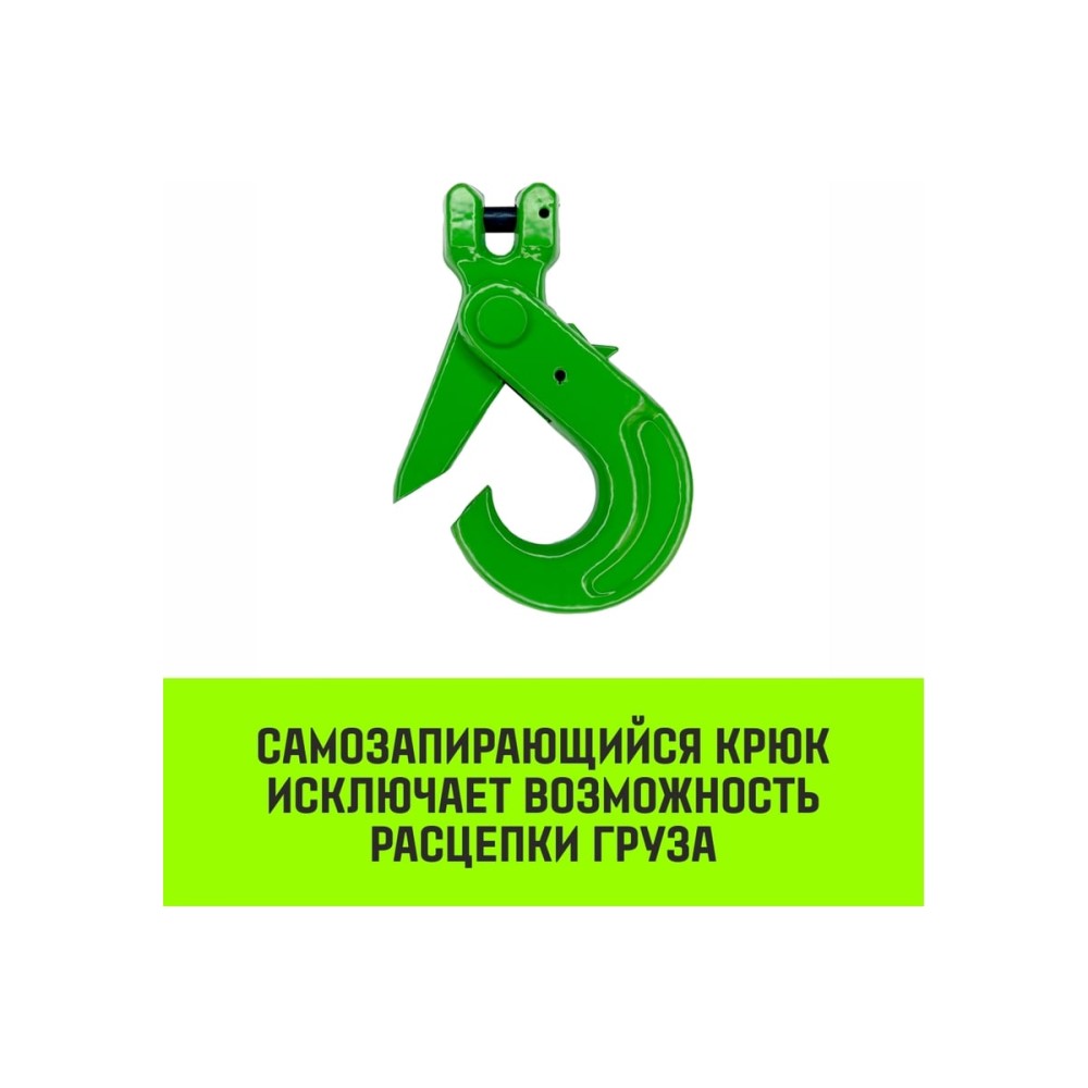 Замок выполнен единой деталью с крепежным элементом крюка, благодаря чему под нагрузкой замок запирается, обеспечивая высокую степень безопасности стропа и надежный захват груза на ветвях. Раскрытие крюка производится только после того как нагрузка с крюка полностью снята и после отжатия предохранителя замка. Коэффициент запаса прочности – не менее 4.