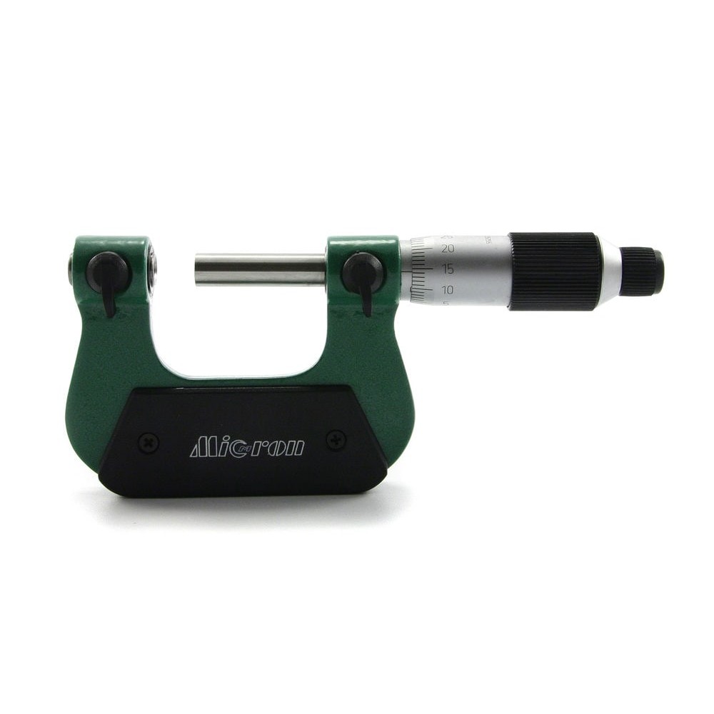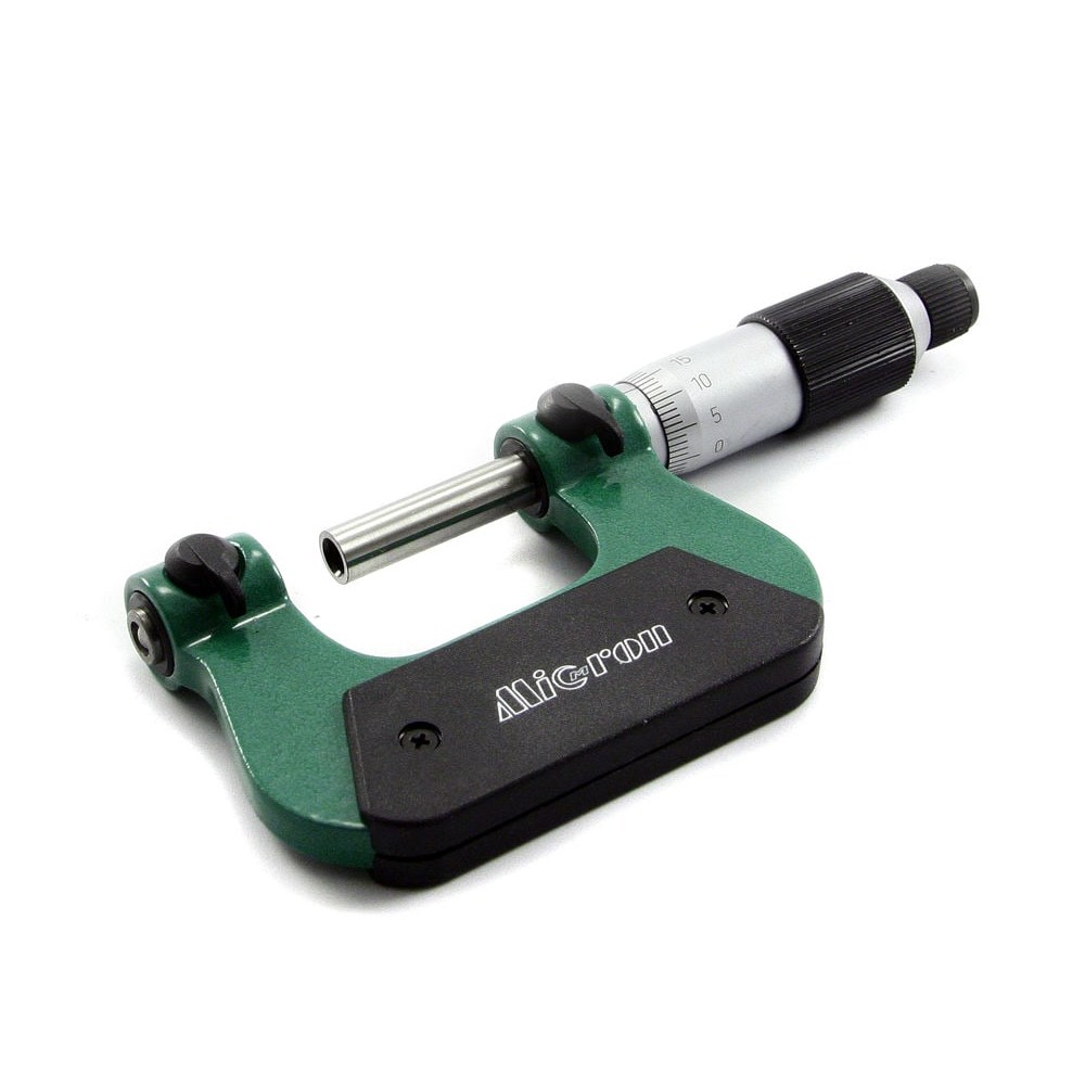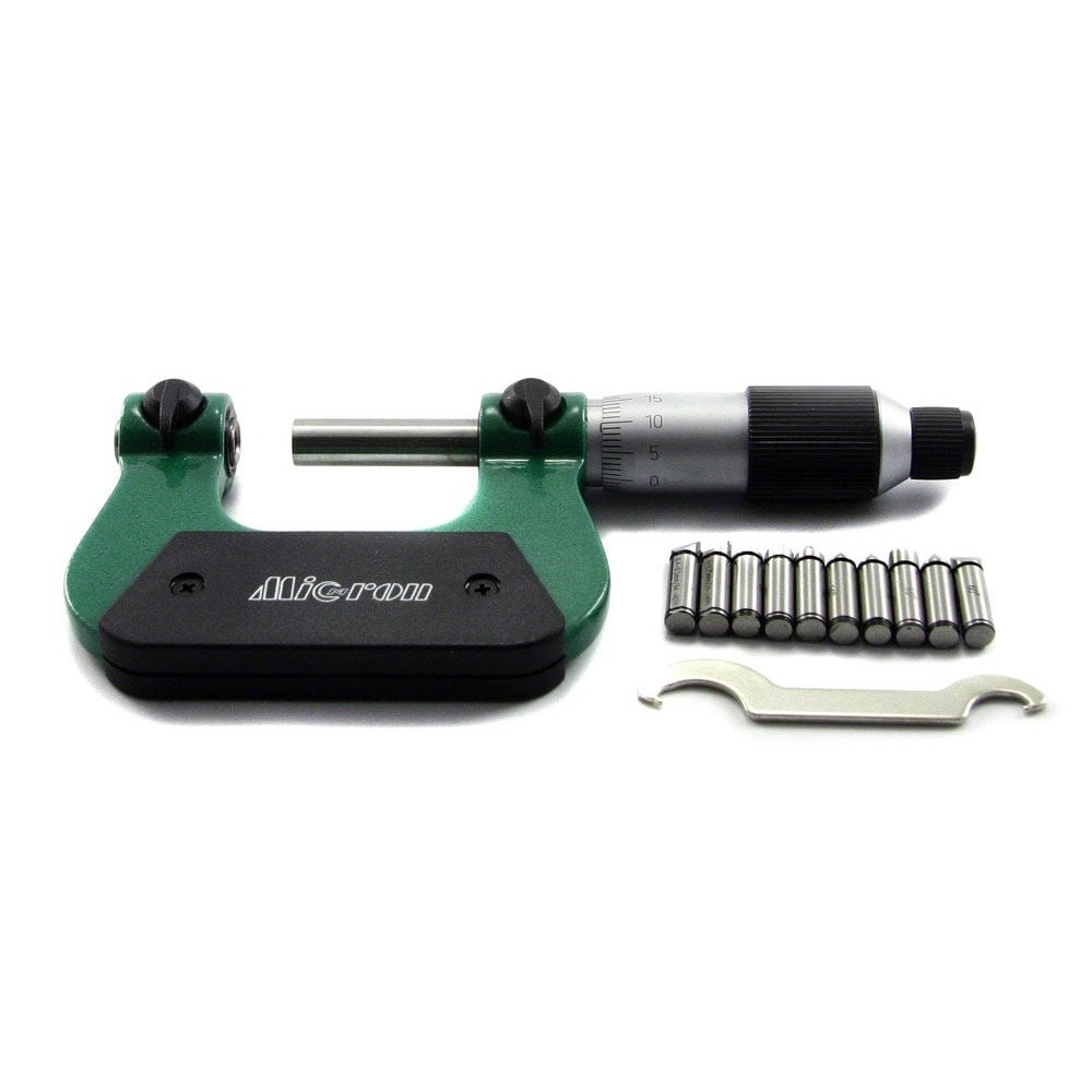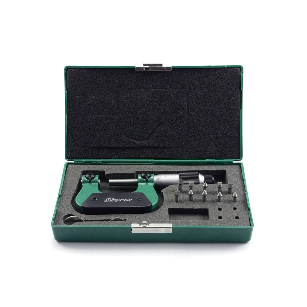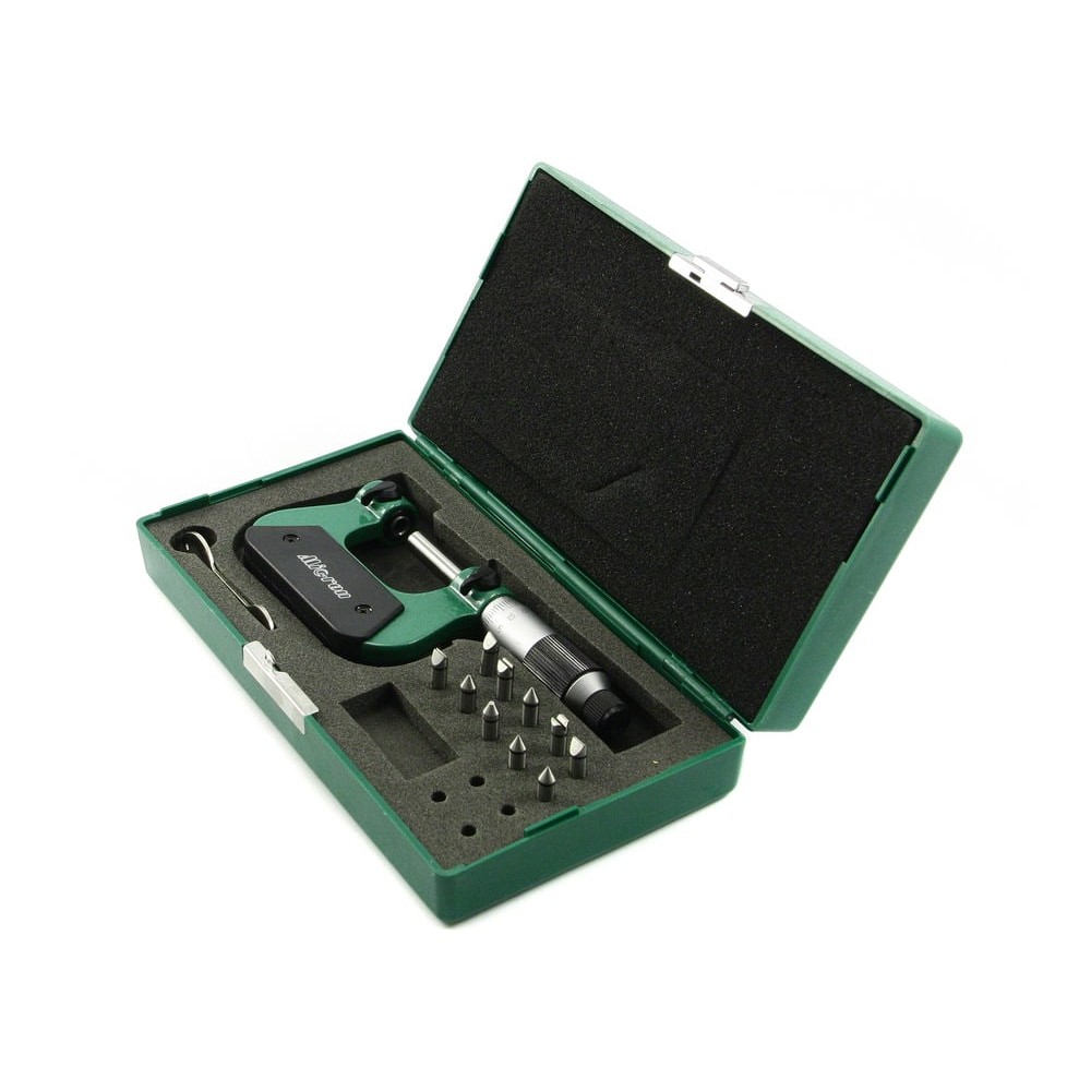 Микрометр резьбовой МВМ-200 0,01 МИК используется в промышленности для измерения среднего диаметра резьбы. Для получения необходимого значения одновременно замеряют и внешний и внутренний диаметр. Угол наконечника призматической вставки необходимо сопоставлять с размером гребня, угол конусной - с размером канавки. В комплекте к инструменту идет свой набор пар вставок различной формы для каждого профиля резьбы. Так же к резьбовому микрометру прилагается установочная мера. Показания снимаются со шкалы стербля и барабана.Шкала инструмента имеет цену деления 0.01 мм и верхний предел измерений 200 мм.Производство компании Micron.
