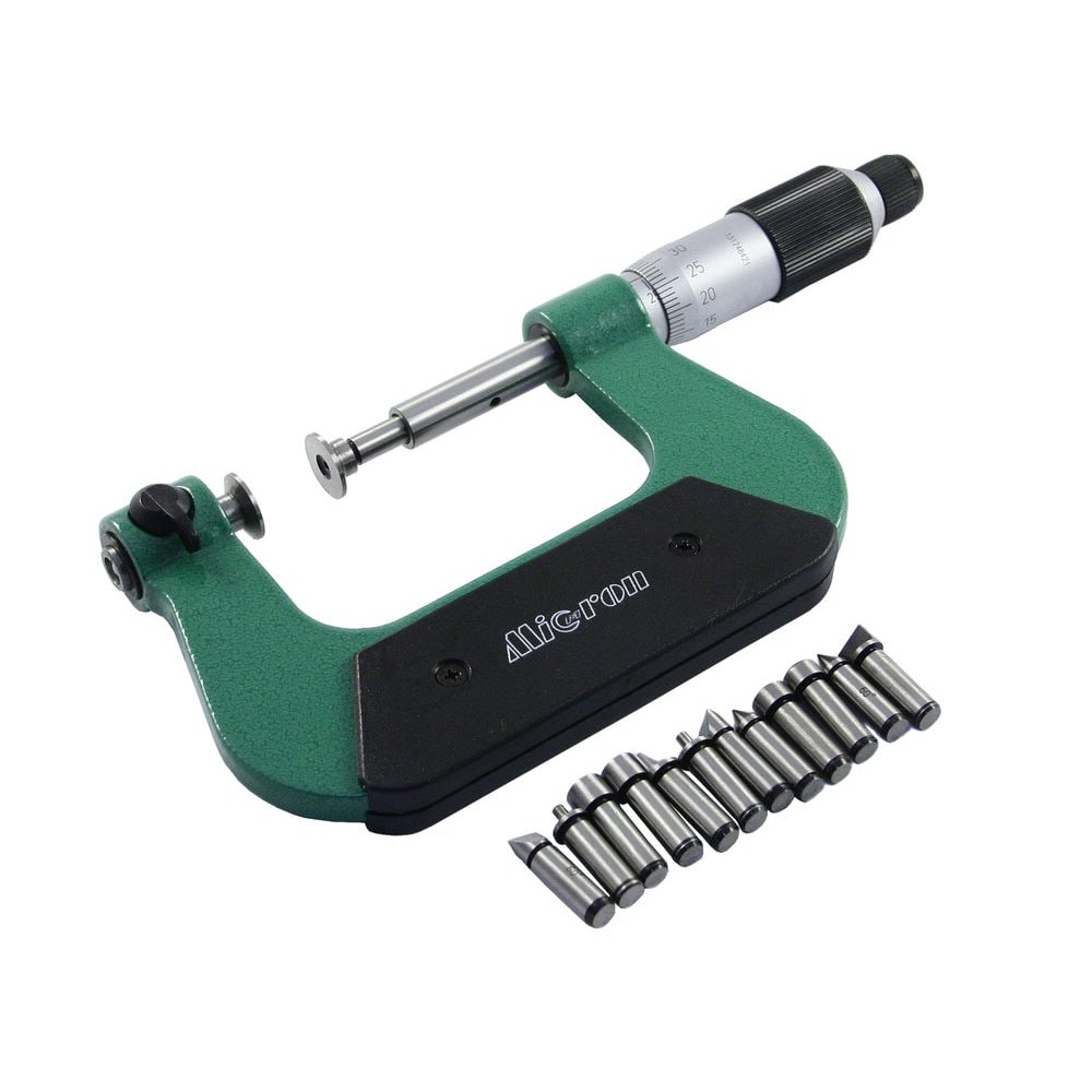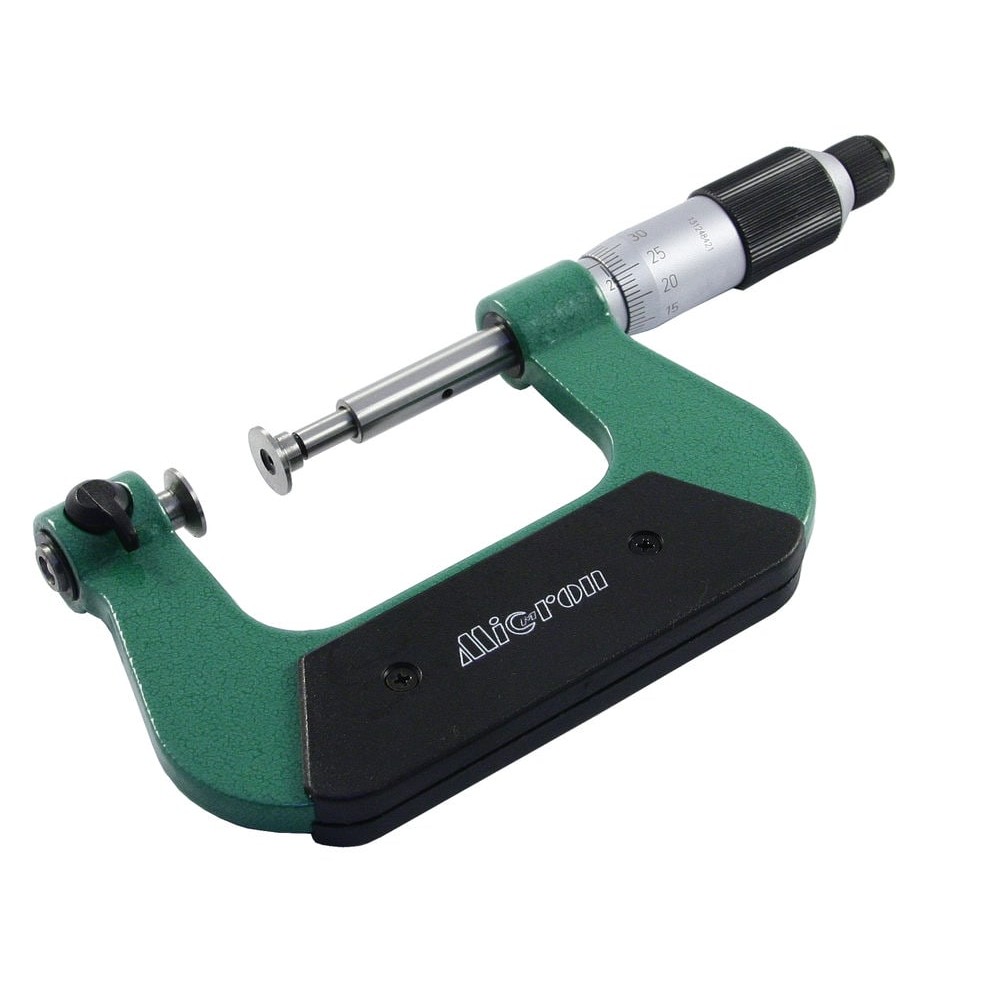 Микрометр универсальный МВУ-150 0,01 МИК - это многофункциональный контактный механический прибор, который позволяет точно, до сотых или тысячных долей миллиметра, измерять объекты небольших размеров. Это очень важно как для производства изделий, так и для контроля качества выпускаемой продукции.Принцип действия микрометра основан на движении винта, который располагается вдоль оси прибора в гайке, закрепленной неподвижно. Для сохранения максимальной точности показанаий, прибор имеет небольшой диапазон измерений, поэтому существуют достаточно много типоразмеров этого инструмента. К универсальному микрометру идет комплект съемных наконечников, каждый из которых используется в своей области:Гладкие вставки - для измерения плоских поверхностейМалые плоские вставки - для измерения труднодоступных мест (пазов, шлицов, шпоночных канавок и др.)Сферические вставки - для измерения вогнутых поверхностей (стенок труб, направляющих шариков)Дисковые вставки - для измерения мягких материзвийные вставки - алов (войлок, ткань, бумага, пластик, резина), а также труднодоступных местЛезвийные вставки - для измерения диаметров резьб и труднодоступных местКонуснообразные вставки - для измерения выточек, узких пазов и канавокТочечные вставки - для измерения расстояний в центрахИзмерения осуществляются по шкалам стебля и барабана микрометрической головки.Шкала инструмента имеет цену деления 0.01 мм и верхний предел измерений 150.Производство компании Micron.
