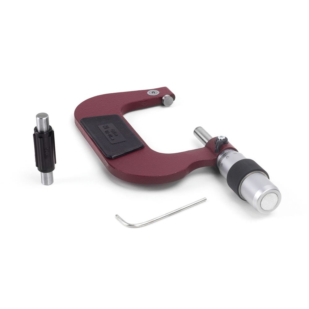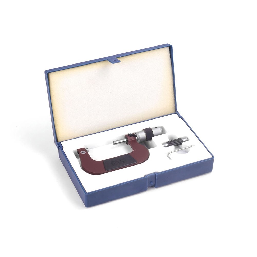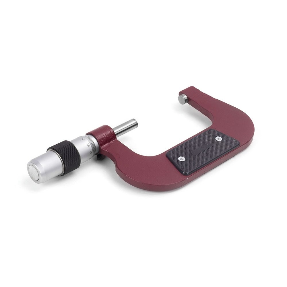 Микрометр МК- 75 0,01 кл.т.1 с пов. КировИнструмент — средство для измерения наружных линейных размеров. Основанием микрометра является скоба, а преобразующим устройством служит винтовая пара, состоящая из микрометрического винта и микрометрической гайки, укреплённой внутри стебля; их часто называют микропарой. В скобу запрессованы пятка и стебель. Измеряемую деталь охватывают торцевыми измерительными поверхностями микровинта и пятки. Барабан присоединён к микровинту с помощью колпачка в котором находится корпус трещотки. Чтобы приблизить микровинт к пятке, вращают барабан трещотку по часовой стрелке (от себя), а для обратного движения микровинта (от пятки) барабан вращают против часовой стрелки (на себя). Закрепляют микровинт в требуемом положении стопором.
