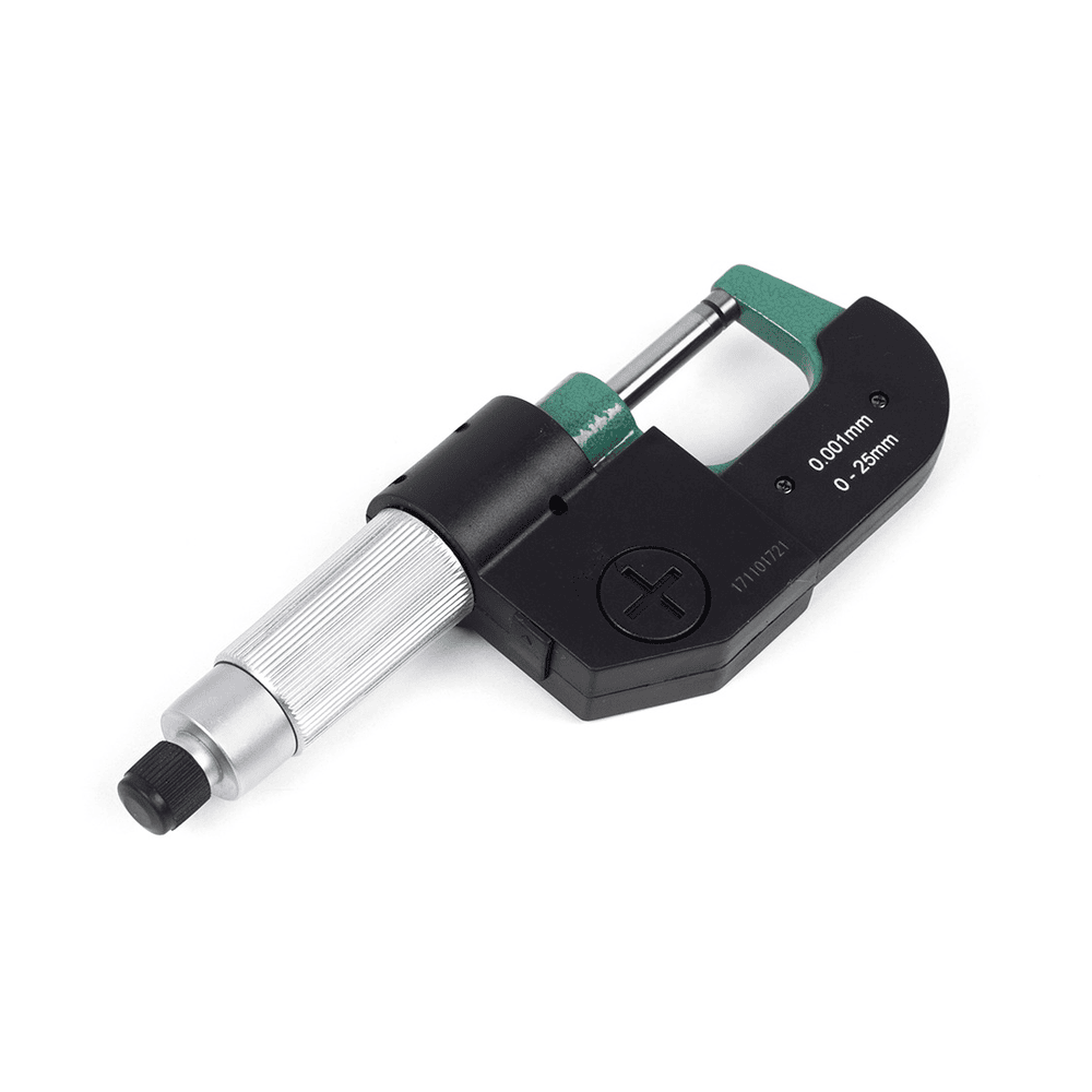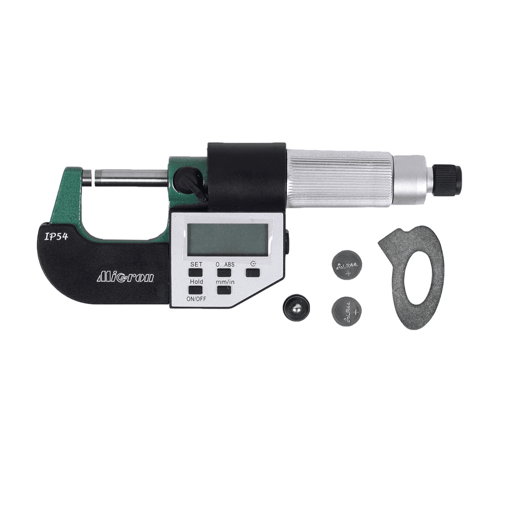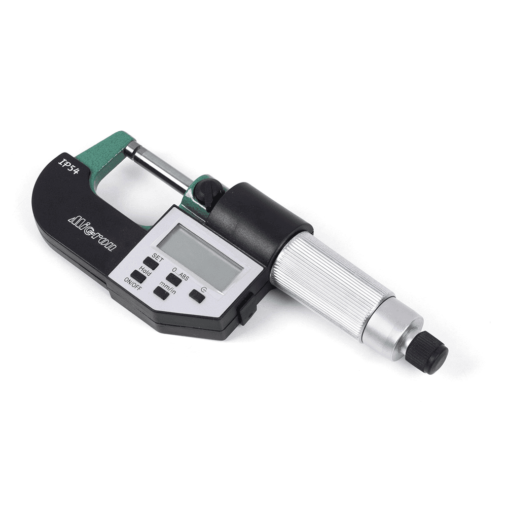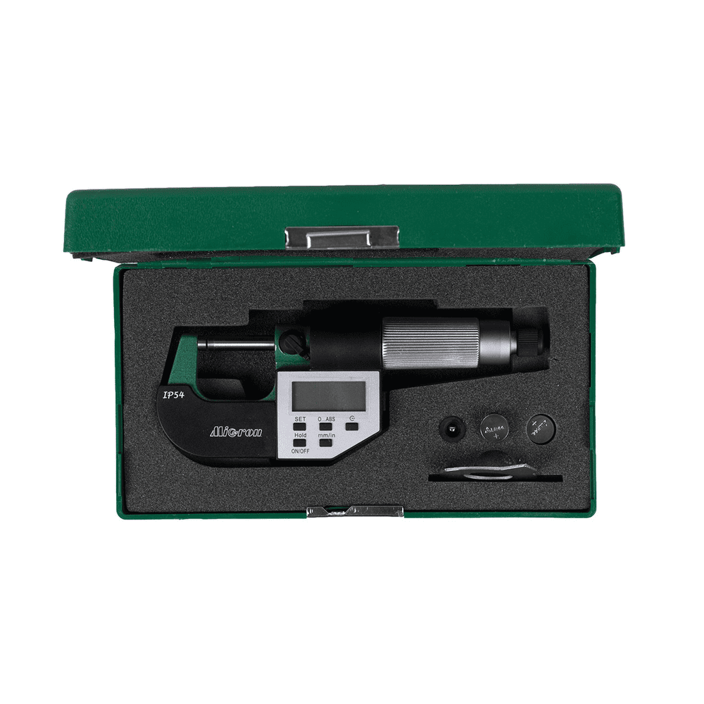 Микрометр МКЦ- 25 0,001 электр. 2-кн. IP65 Micron PRO - цифровой микрометр для измерения наружных линейных поверхностей. Используется в области малых размеров с низкой погрешностью (от 2 мкм до 50 мкм в зависимости от класса точности инструмента и измеряемых диапазонов). Преобразовательным механизмом микрометра является микропара винт-гайка. Принцип измерения микрометром построен на перемещение винта вдоль оси при вращении его в неподвижной гайке. Перемещение пропорционально углу поворота винта вокруг оси. Полные обороты отсчитывают по шкале, нанесённой на стебле микрометра, а доли оборота — по круговой шкале, нанесённой на барабане. Данный микрометр компании Micron имеет цифровой ЖК-дисплей, верхнуюю границу диапазона измерения 25 мм, цену деления 0,001 мм.