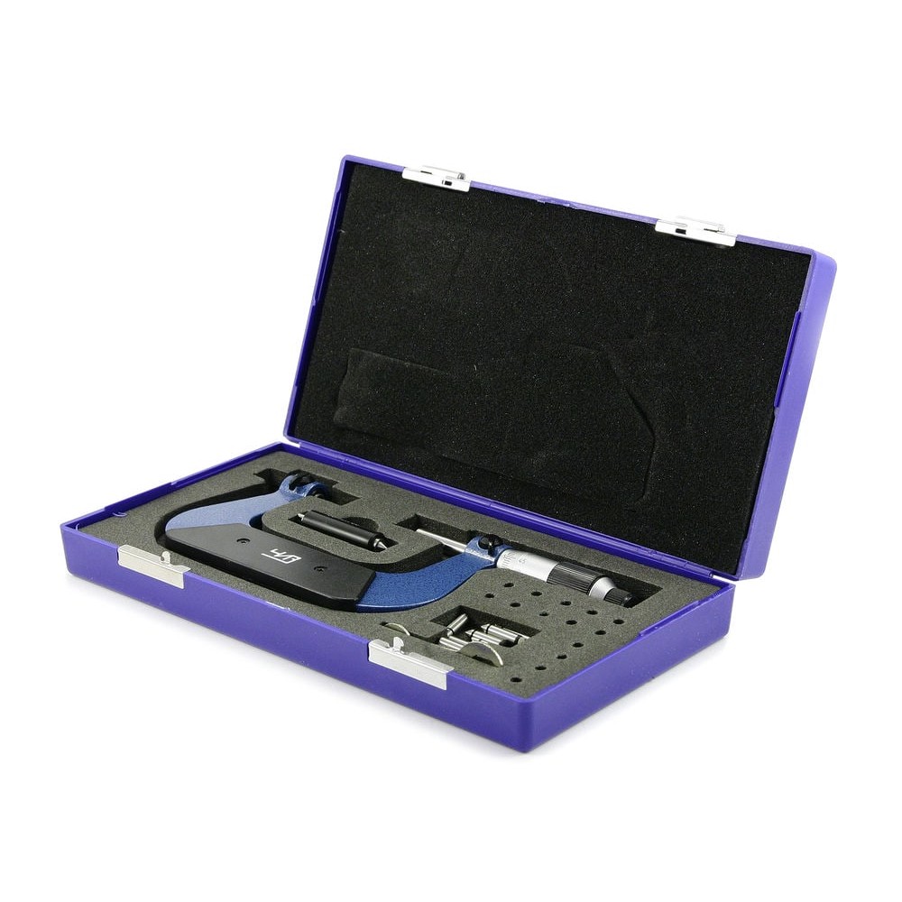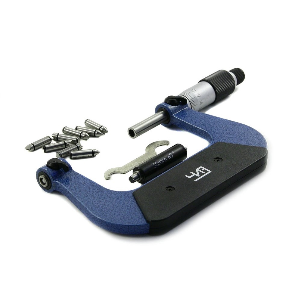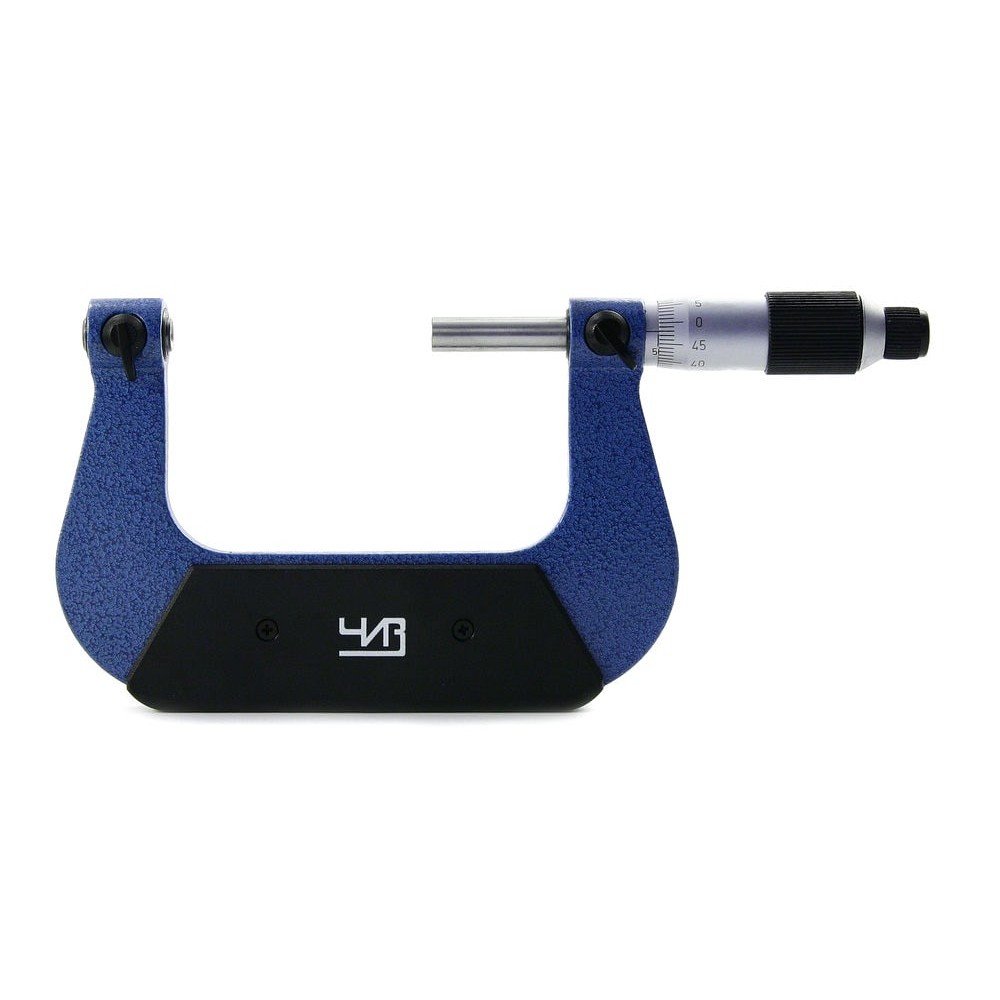Микрометр резьбовой МВМ- 75 0,01 ЧИЗ используется в промышленности для измерения среднего диаметра резьбы. Для получения необходимого значения одновременно замеряют и внешний и внутренний диаметр. Угол наконечника призматической вставки необходимо сопоставлять с размером гребня, угол конусной - с размером канавки. В комплекте к инструменту идет свой набор пар вставок различной формы для каждого профиля резьбы. Так же к резьбовому микрометру прилагается установочная мера. Показания снимаются со шкалы стербля и барабана.