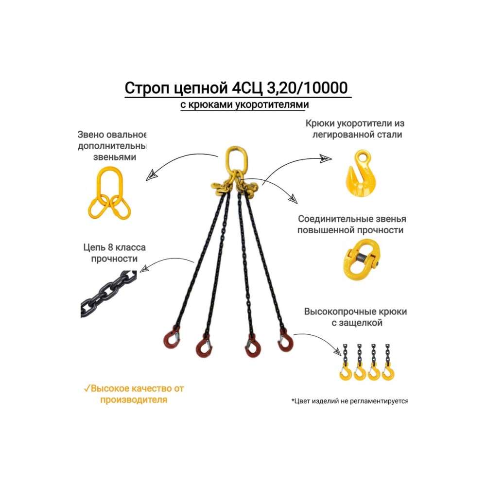 Цепной четырехветвевой строп - универсальное такелажное приспособление, применяемое при грузоподъемных работах и изготавливается из легированной стали высокой прочности класса Т8. Коэффициент запаса прочности 4:1. Надежность и неприхотливость данного стропа позволяет применять его повсеместно, в таких сферах как строительство, металлургия, добывающие отрасли, станкостроительное производство, сельское хозяйство и мн. др.