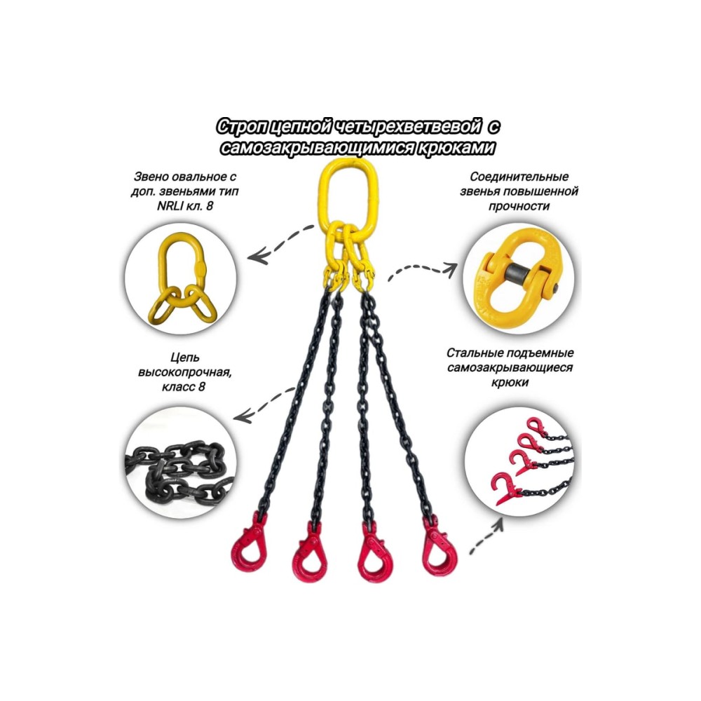 Цепной четырехветвевой строп КанТраст 4СЦ с самозакрывающимися крюками - служит для надежной фиксации при подъеме и перемещении тяжелых грузов. Это универсальное такелажное приспособление, применяемое при грузоподъемных работах и изготавливается из легированной стали высокой прочности класса Т8. Коэффициент запаса прочности 4:1.