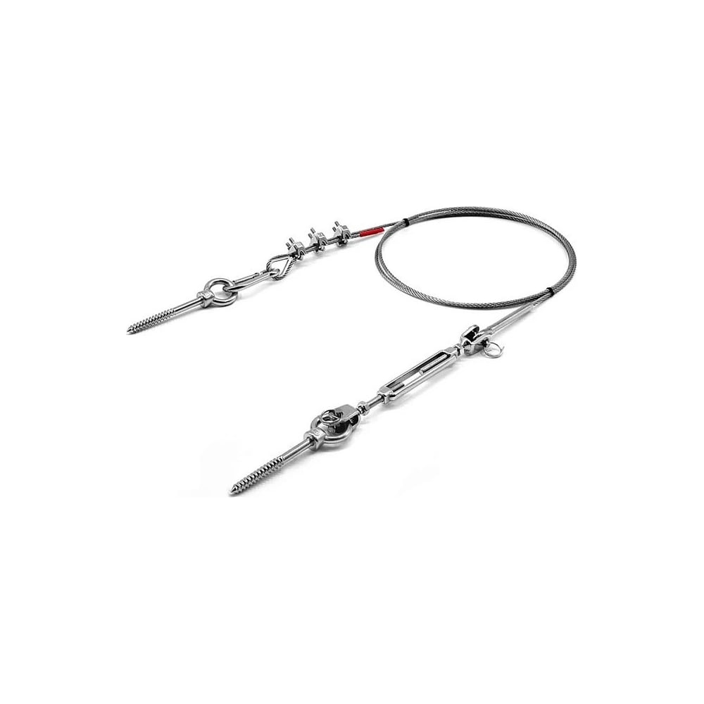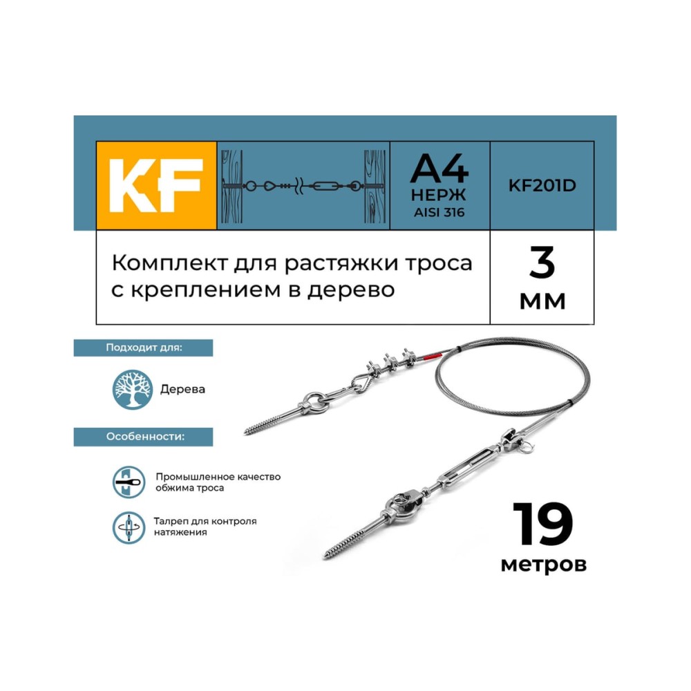 Комплект KF201D предназначен для натяжения нержавеющего троса диаметром 3 мм между двумя деревянными поверхностями. С одного конца трос имеет наконечник с петлей, обжатый на профессиональном оборудовании. Длина комплекта регулируется за счет крепления через коуш на 3 зажима, устанавливаемых с противоположной стороны троса. Натяжение осуществляется за счет талрепа вилка-вилка М5. Конструкция крепится в деревянную поверхность на рым-шуруп М6х60 мм через карабин пружинный 5х50 мм.Все элементы конструкции выполнены из нержавеющей стали марки А4 (AISI 316), обладающей повышенной коррозионной стойкостью. Это позволяет использовать Комплект KF201D, как под открытым небом, так и в агрессивных средах: плавательных бассейнах, вблизи автомобильных трасс и т.д.