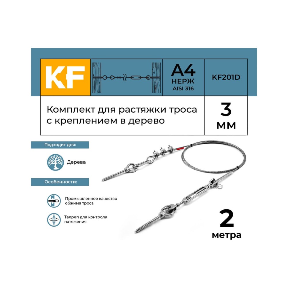 Комплект KF201D предназначен для натяжения нержавеющего троса диаметром 3 мм между двумя деревянными поверхностями. С одного конца трос имеет наконечник с петлей, обжатый на профессиональном оборудовании. Длина комплекта регулируется за счет крепления через коуш на 3 зажима, устанавливаемых с противоположной стороны троса. Натяжение осуществляется за счет талрепа вилка-вилка М5. Конструкция крепится в деревянную поверхность на рым-шуруп М6х60 мм через карабин пружинный 5х50 мм.Все элементы конструкции выполнены из нержавеющей стали марки А4 (AISI 316), обладающей повышенной коррозионной стойкостью. Это позволяет использовать Комплект KF201D, как под открытым небом, так и в агрессивных средах: плавательных бассейнах, вблизи автомобильных трасс и т.д.