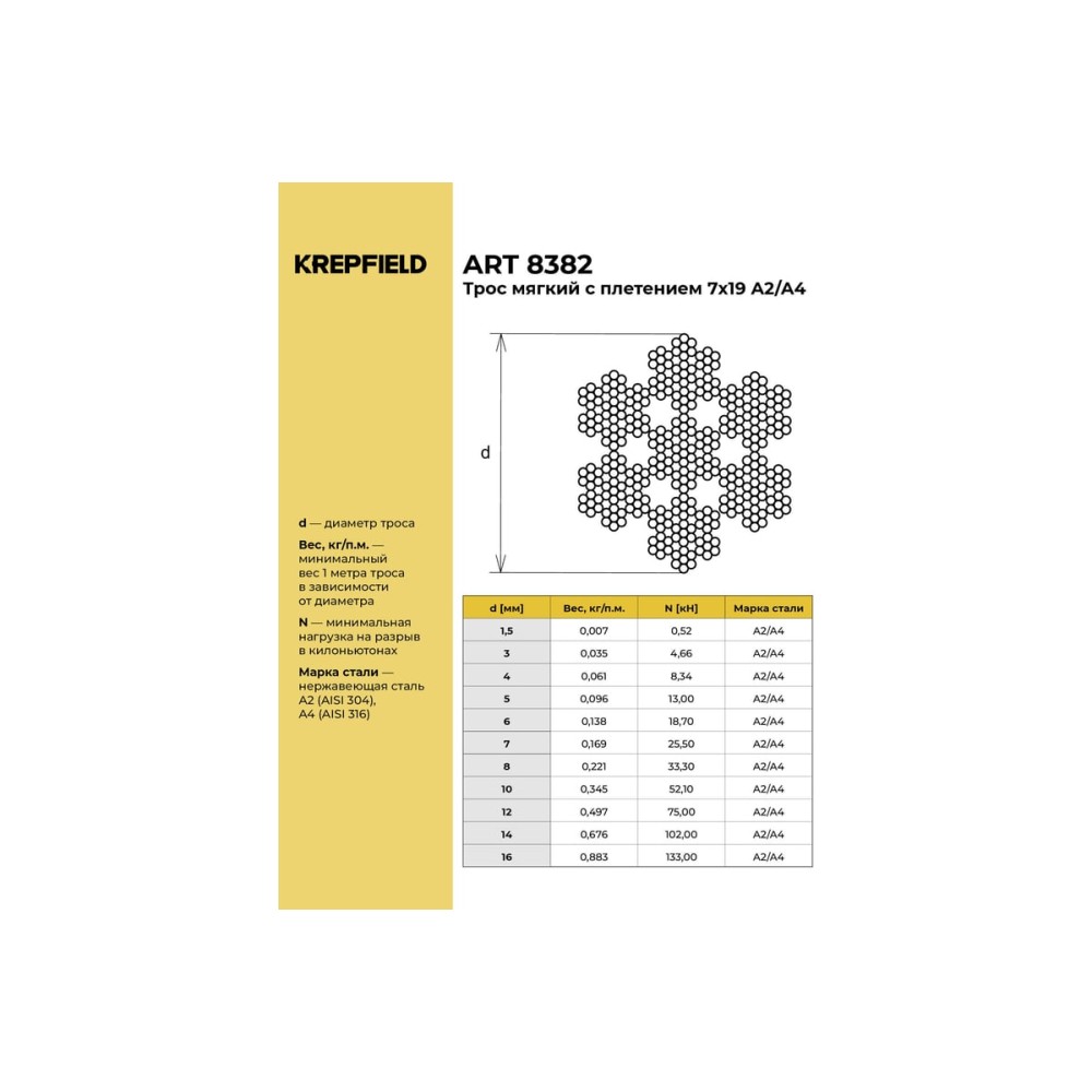 Трос нержавеющий KREPFIELD 8 мм, ART 8382 А4, мягкий, 250 м 8382А4ТРОС8ММ-250