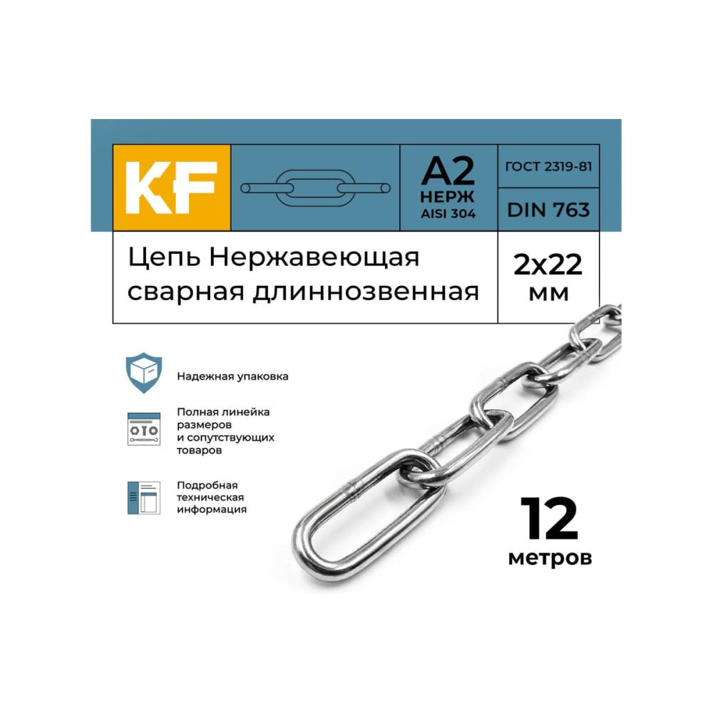 Цепь нержавеющая KREPFIELD 2x22 мм DIN 763 А2 сварная длиннозвенная 12 метров 763А2ЦЕПЬ2ММ-12