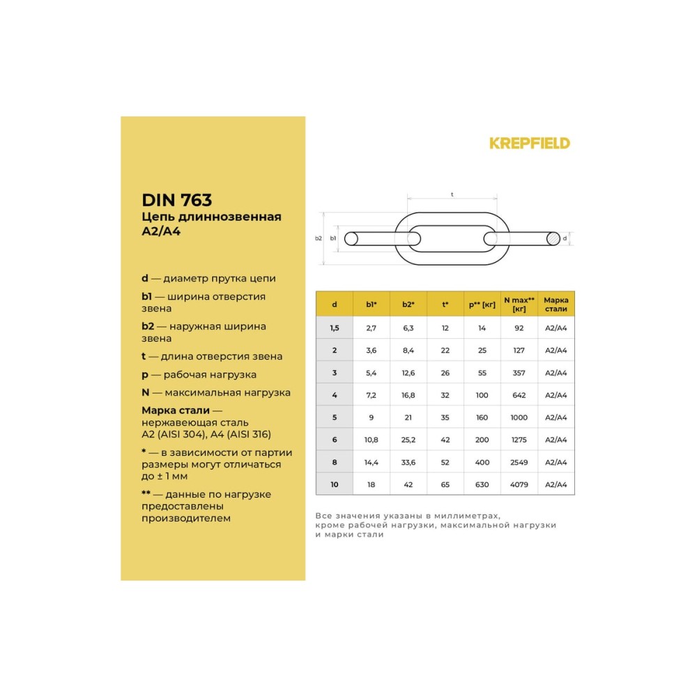 Цепь Нержавеющая KREPFIELD 2x22 мм DIN 763 А2 сварная длиннозвенная 1 метр 763А2ЦЕПЬ2ММ-1
