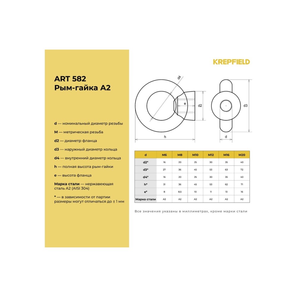 Технические характеристики рыма гайка KREPFIELD нержавеющая М8 А2