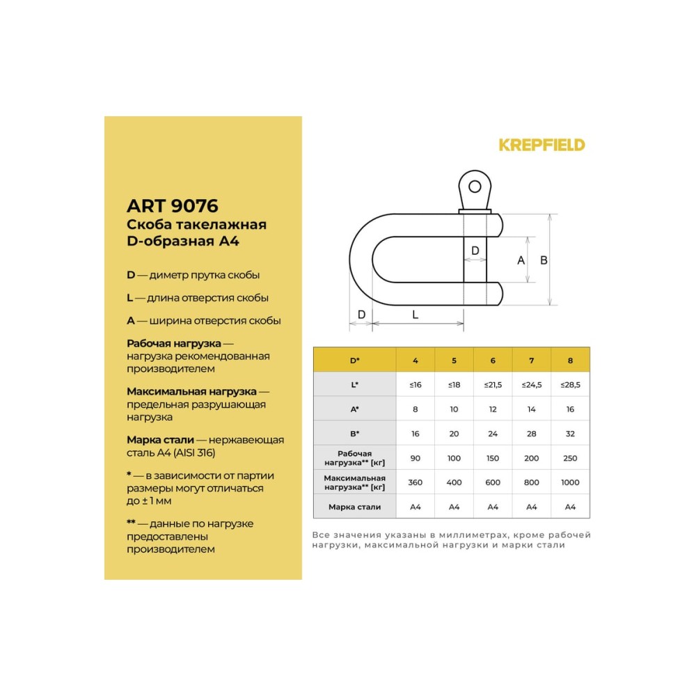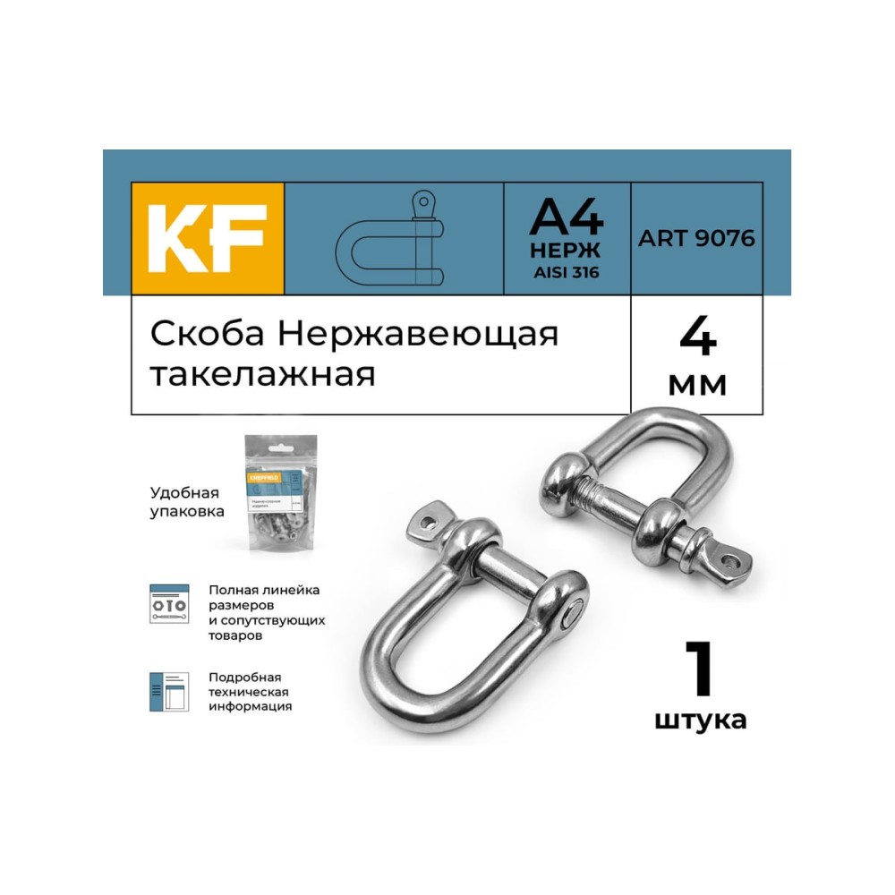Технические характеристики скобы KREPFIELD нержавеющая 4 мм А4 такелажная