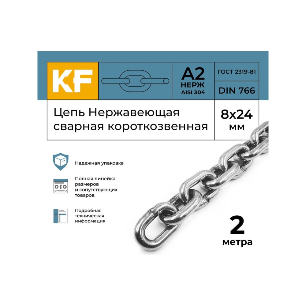 Технические характеристики цепи KREPFIELD нержавеющая 8x24 мм DIN 766 А2 сварная короткозвенная 2 метра