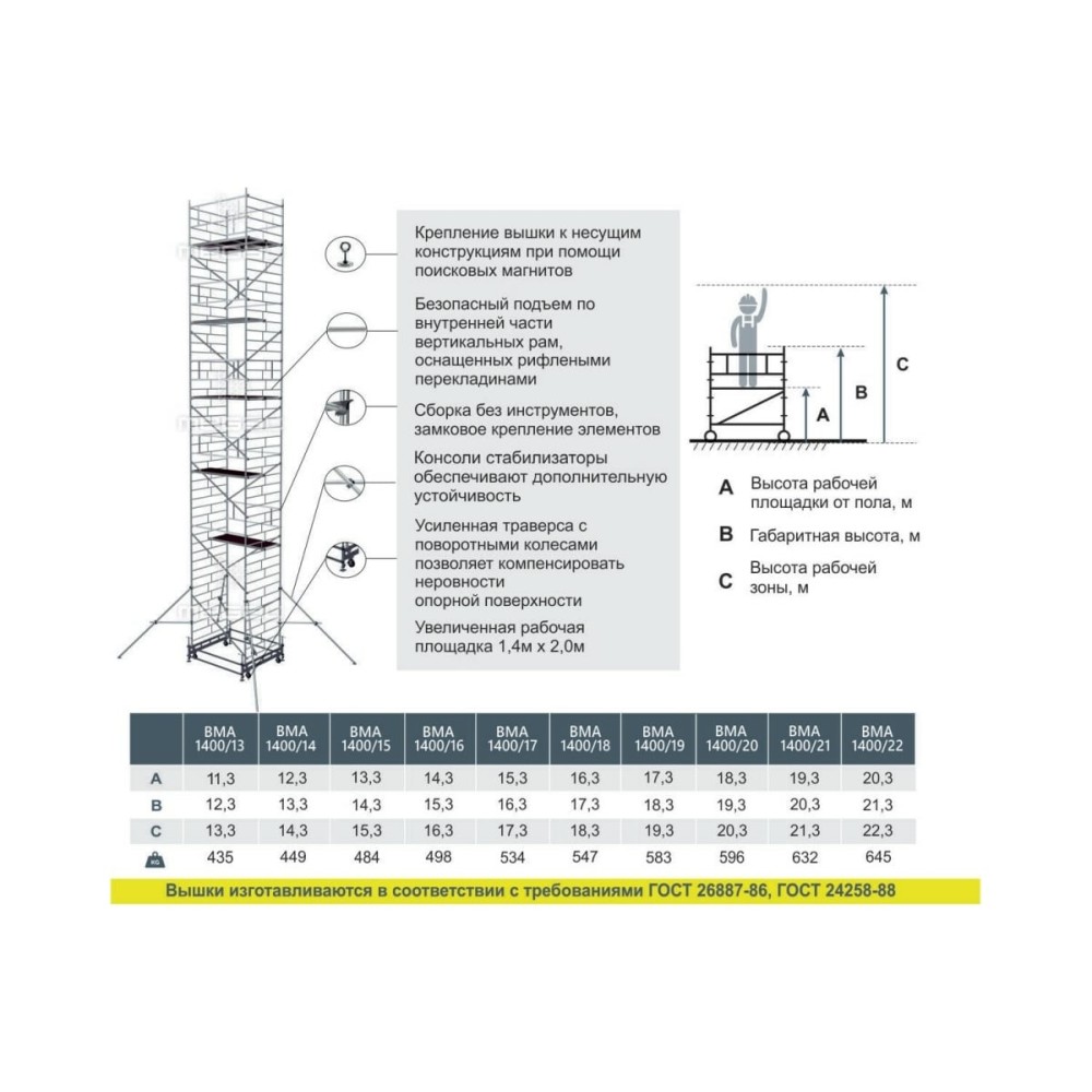 Тип модульная Материал алюминий Max высота 19.3 м Высота секции 18.3 м Высота площадки 17.3 м Размер площадки 2х1.4 м Max нагрузка 560 кг Количество секций 8 Ширина площадки 1.4 м Длина площадки 2 м Тип труб профиль Площадка в комплекте да Колеса в комплекте да Винтовые опоры да Вес нетто 583 кг Опоры-стабилизаторы даПреимущества MEGAL ВМА 1400/19