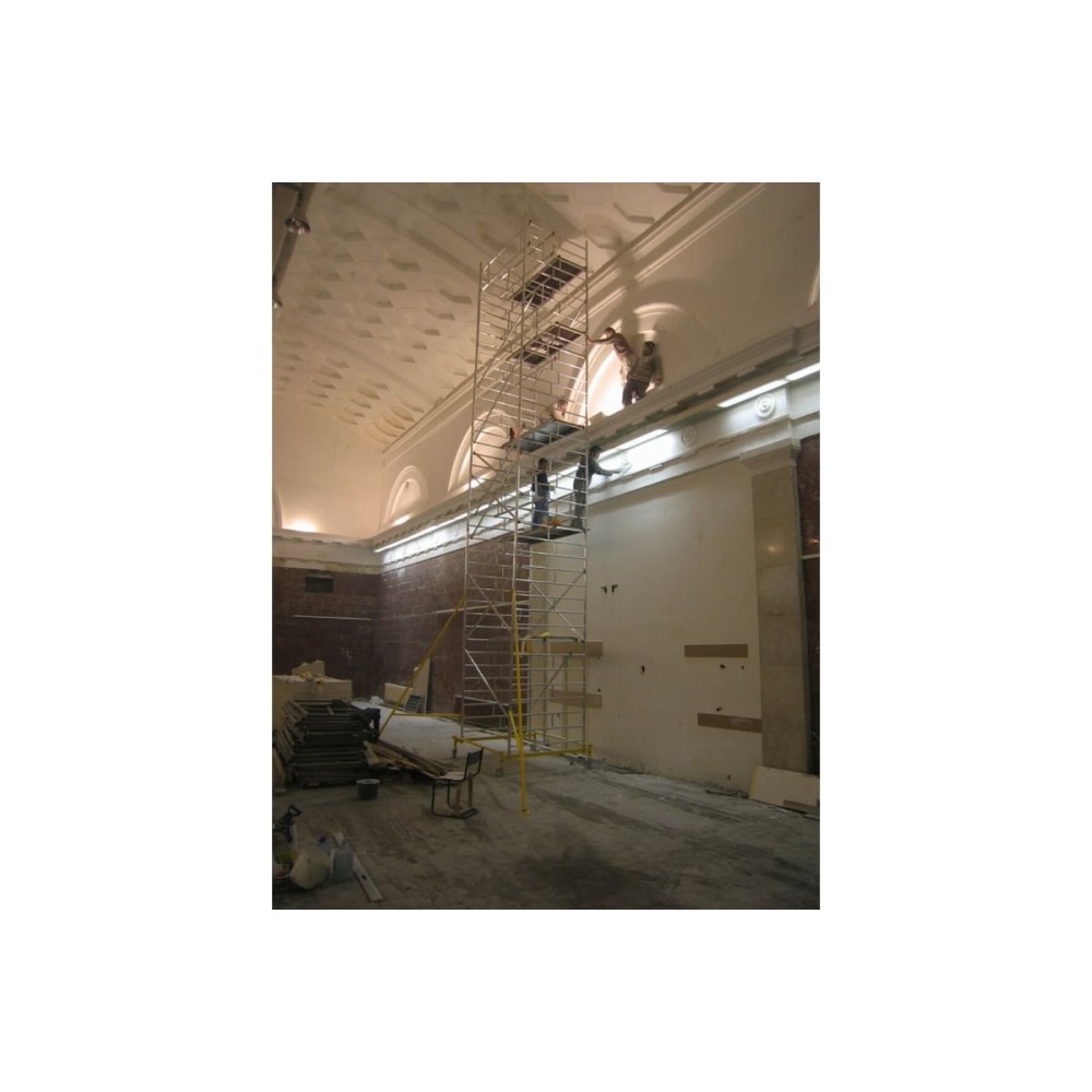 Модульная алюминиевая вышка MEGAL ВМА 1400/19 4687201843078 обеспечивает подъем и организацию рабочего места на высоте с использованием лестничных маршей в строительно-монтажных, ремонтных и прочих работах.