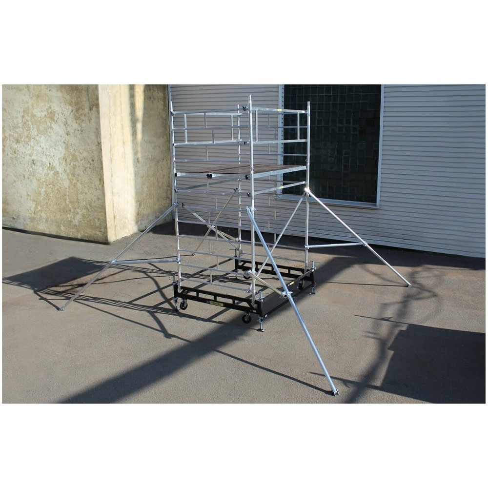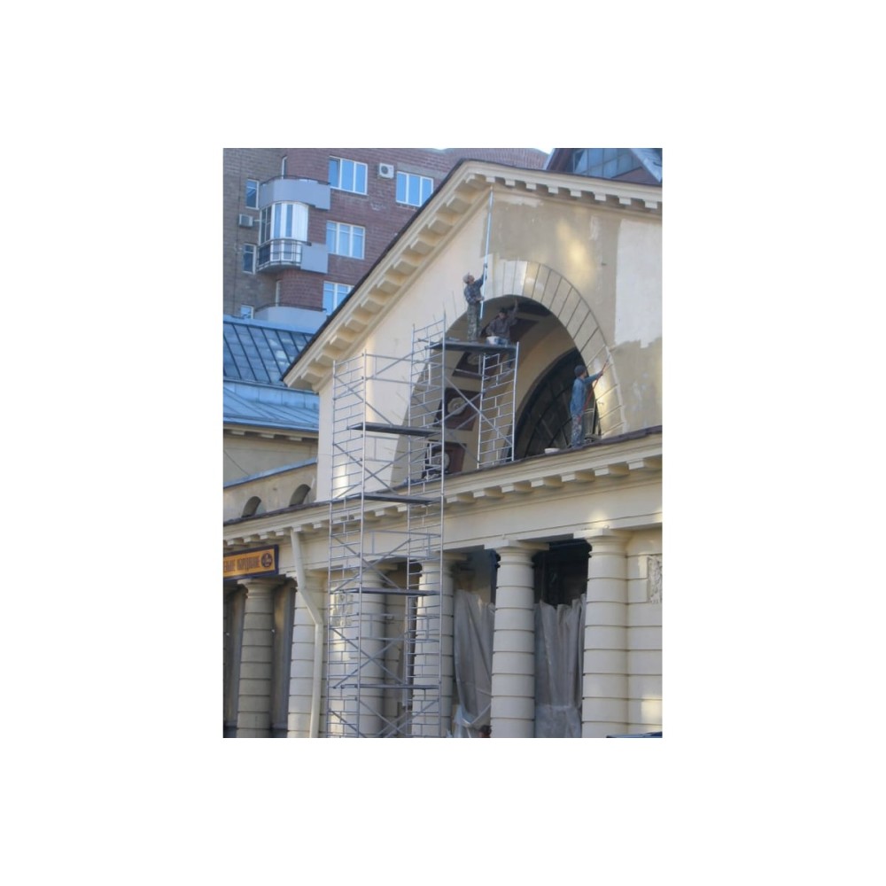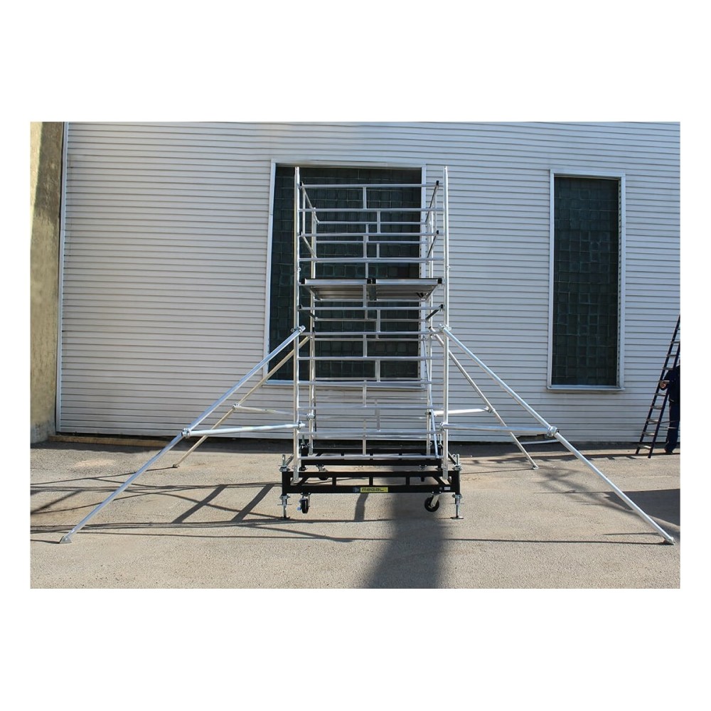 Вышки габаритной высотой 5 метров и более оснащены консолями-стабилизаторами (4 шт.). Монтируются на усиленном широком основании из двойной траверсы с колесами. Опорная поверхность на домкратах (исключая колеса).