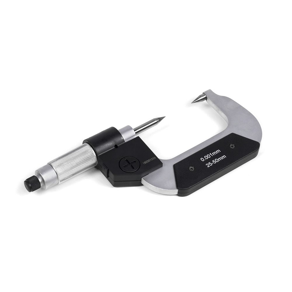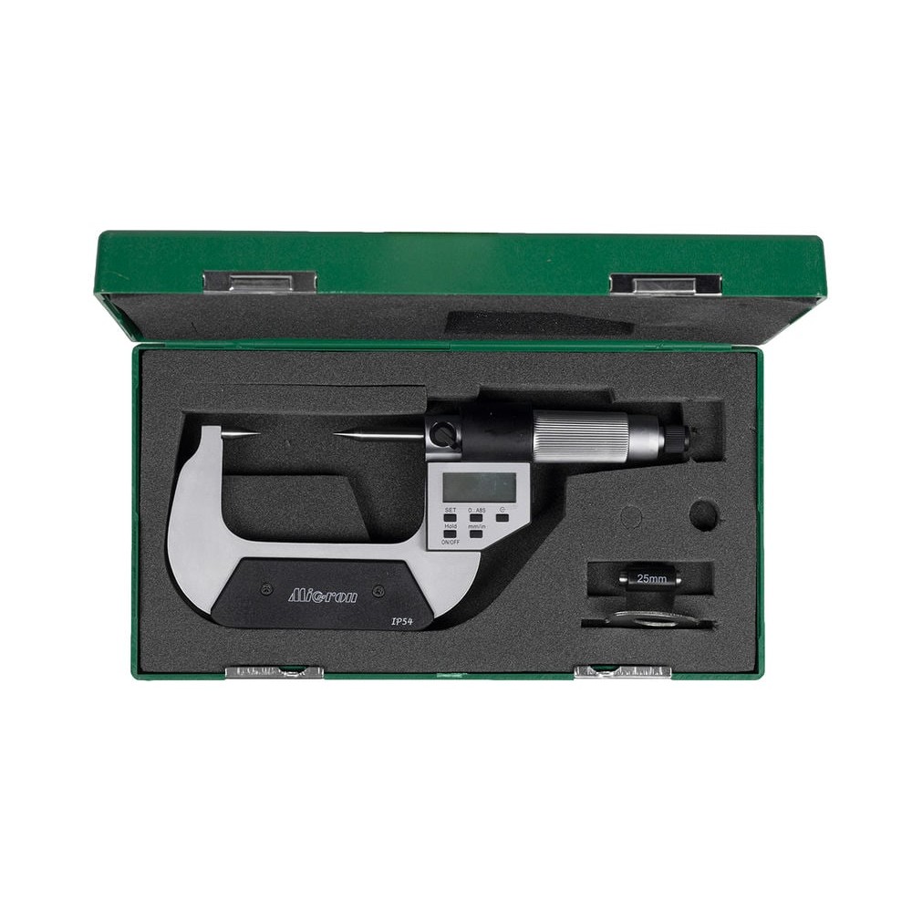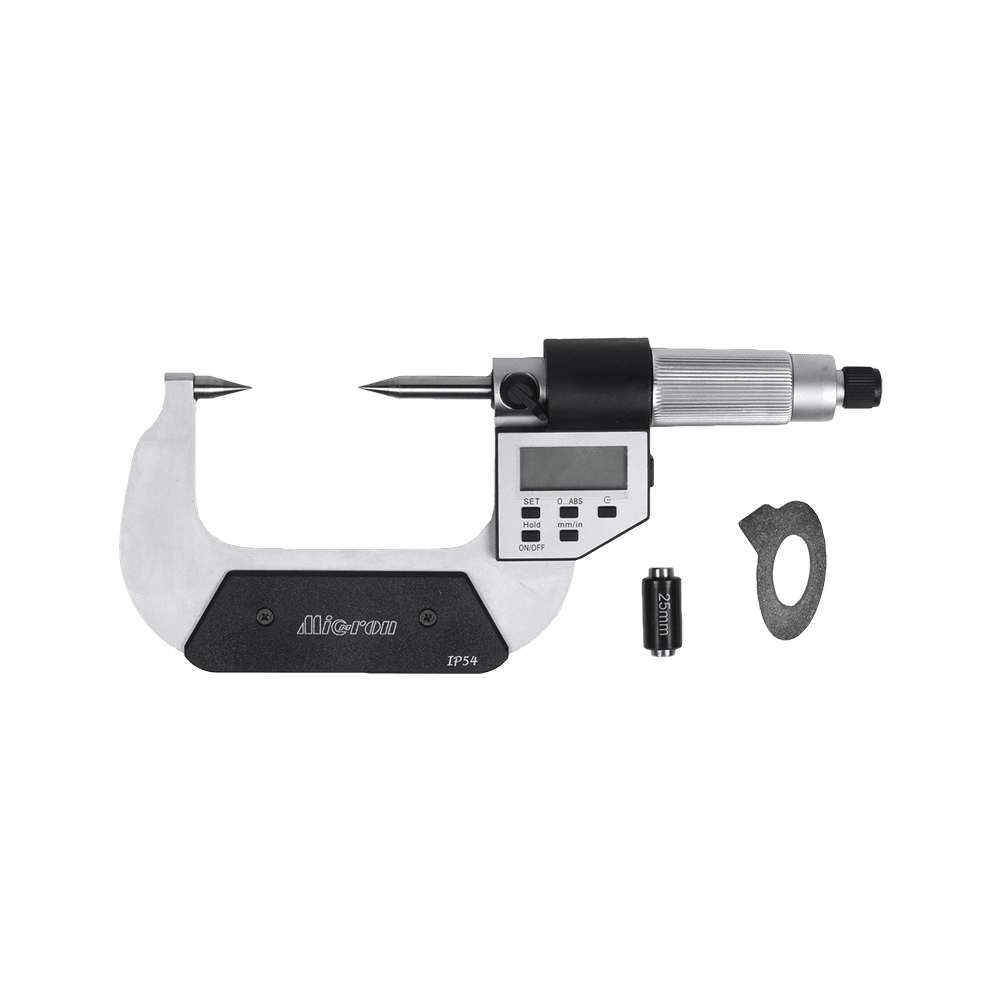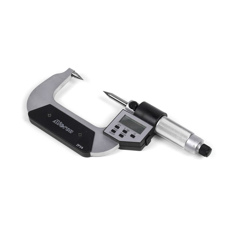 Электронная версия имеет цифровое отсчетное устройство, благодаря которому показания считываются быстрее и проще. Так же можно быстро переключится на метрическую или дюймовую систему исчисления, установить на нуль, поставить пределы допуска и другие удобные функции. По сравнению с механическим точечным микрометром, цифровой обладает большей точностью: до тысячных долей миллиметра. Микрометр имеет высокую точность измерения и выполнен из качественных материалов. Прибор оснащен теплоизоляционными вставками, измерительные поверхности выполнены из твердого сплава, что значительно продлевают его срок службы. Инструмент упакован в пластиковый или деревянный бокс для удобства хранения и транспортировки.