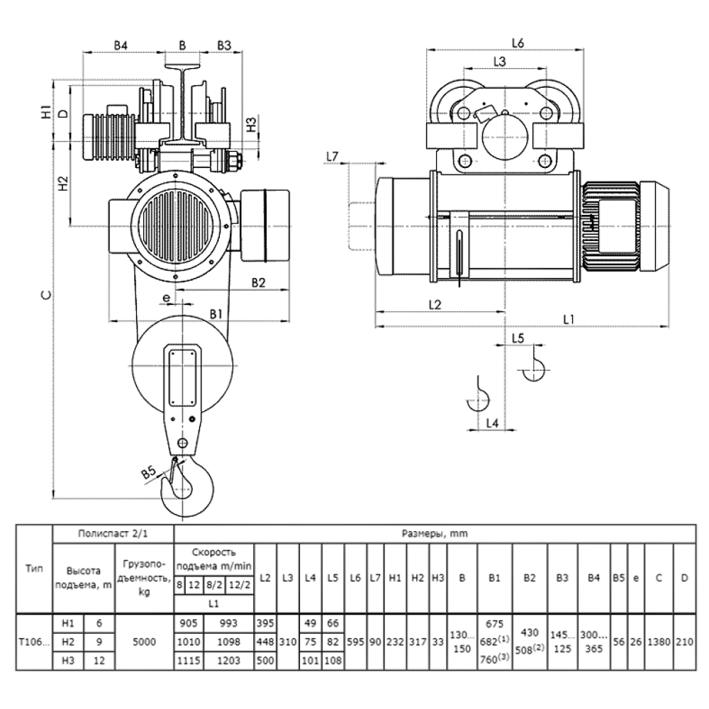 Таль электрическая передвижная 13 T10 622 г.п. 5 т; в.п. 9 м; полиспаст 2/1; ск. пер. 20 м/мин; ск. под. 8 м/ мин; Темп. реж. -20 + 40; У3;Напряжение 380 В; Класс защ. IP 54; Подвесной пульт управления.