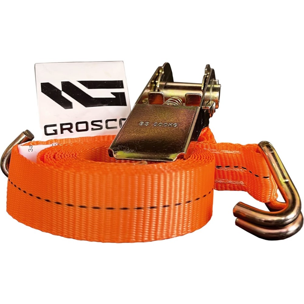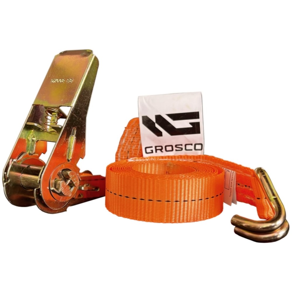 Стяжной ремень GROSCO с крюками и храповым механизмом применяется для фиксации груза на различных видах транспорта.