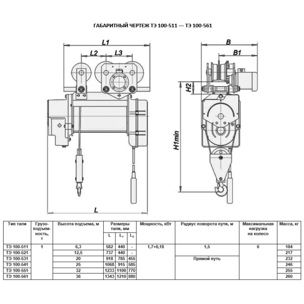 Таль ТЭ-100 – данная канатная электрическая таль, как и все тали ТЭ, имеет тележку передвижения с электроприводом, которая крепится на двутавр 18М-36М. Мощность двигателя передвижения позволяет перемещать груз массой 1 т (тонна) со скоростью 20 метров в минуту. Тормоз передвижения, позволяет надежно зафиксировать таль, и исключить ее дрейфование по балке.