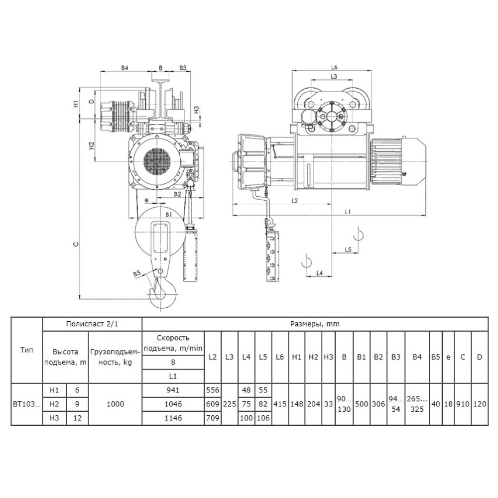 Таль электрическая передвижная взрывобезопасная ВT10 316 г.п. 1 т; в.п. 6 м; полиспаст 2/1; ск. пер. 20 м/мин; ск. под. 8 м/ мин; Темп. реж. -20 + 40; У3;Напряжение 380 В; Класс защ. IP 54; Подвесной пульт управления.