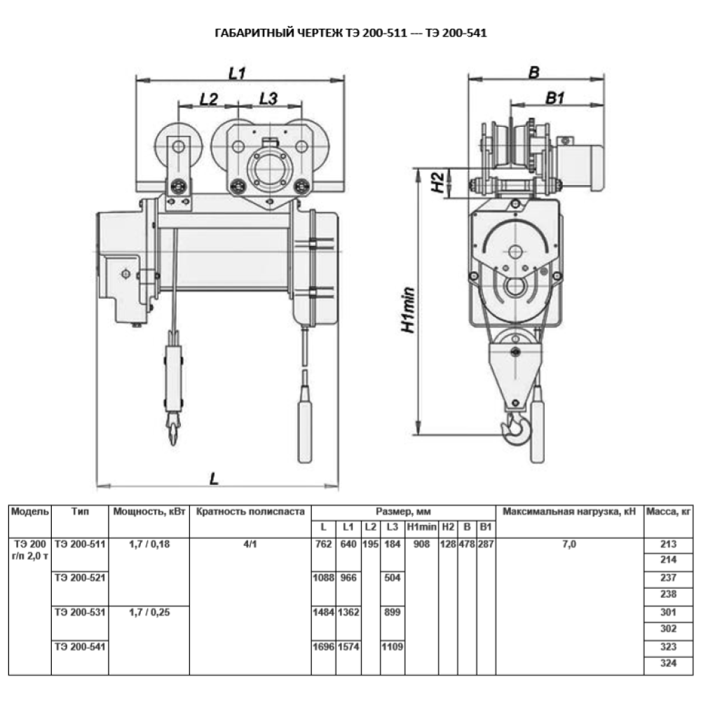 Таль электрическая передвижная ТЭ 200-511 г.п. 2000 кг; в. п. 6м; полиспаст 2/1; ск. пер. 20 м/мин; ск. под. 8 м/ мин; Темп. реж. -20 + 40; У3;Напряжение 380 В; Класс защ. IP 54; Подвесной пульт управления.