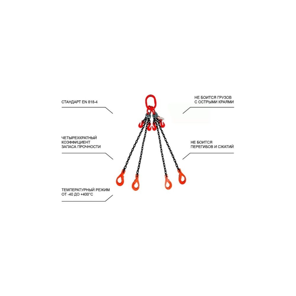 Тип цепной Грузоподъемность 4.25 т Материал сталь Длина 4 м Количество ветвей 4 шт Размер звена 8 х 24, 8 класс (Т8) мм ГОСТ/ТУ EN 818-4-2011 Класс грузоподъемности 8 Крюки укоротители даПреимущества OCALIFT 4sc4250t4sh