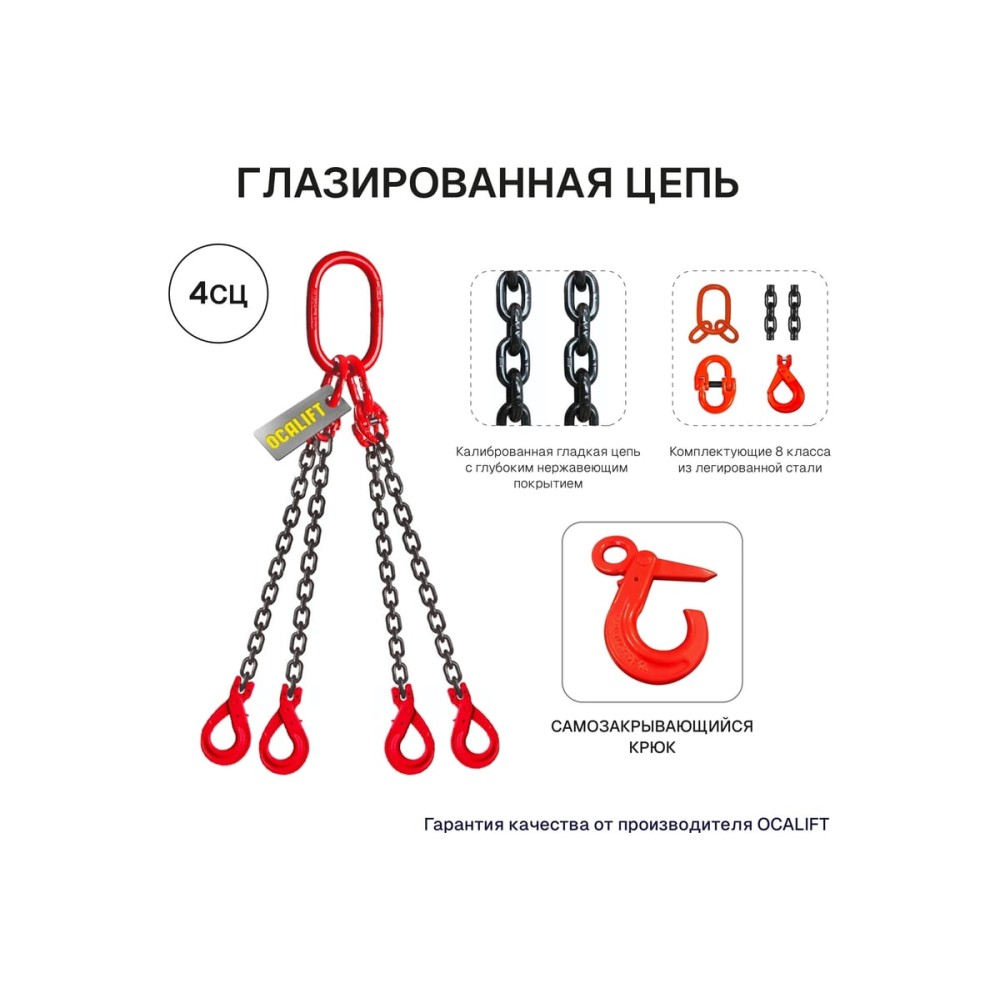Цепной четырехветвевой строп OCALIFT 11,2 т, 5 м, 4СЦ, с самозакрывающимися крюками цепь глазированная 8кл G80 4sc11200t5s