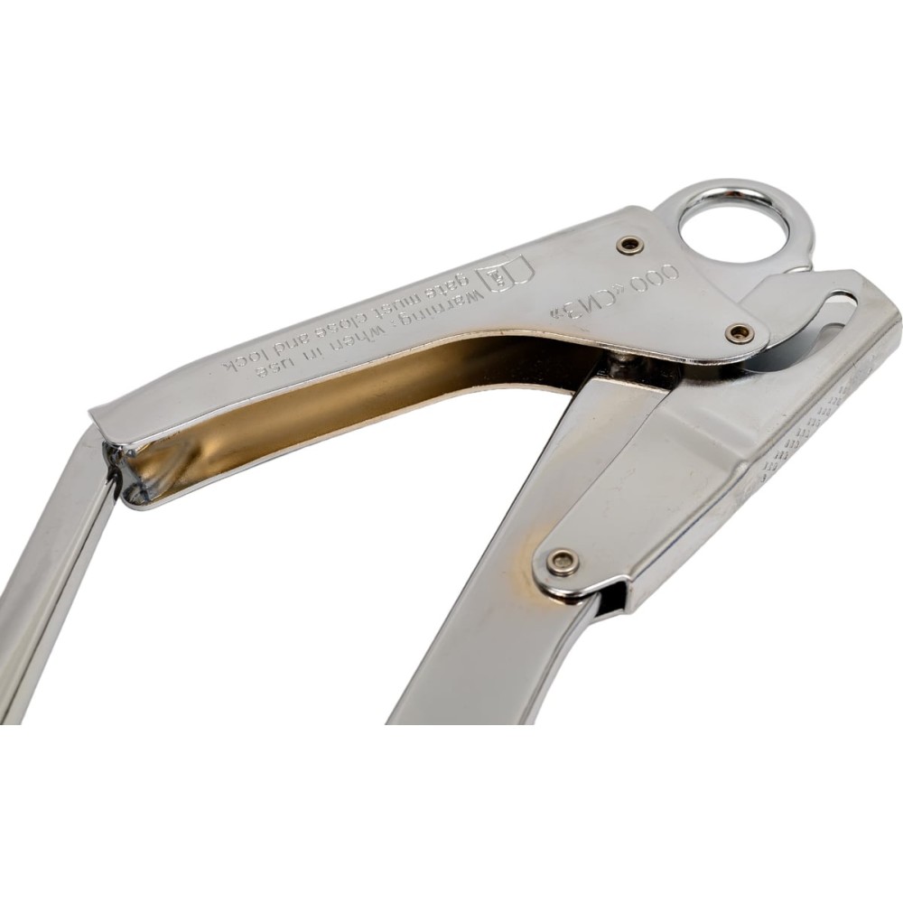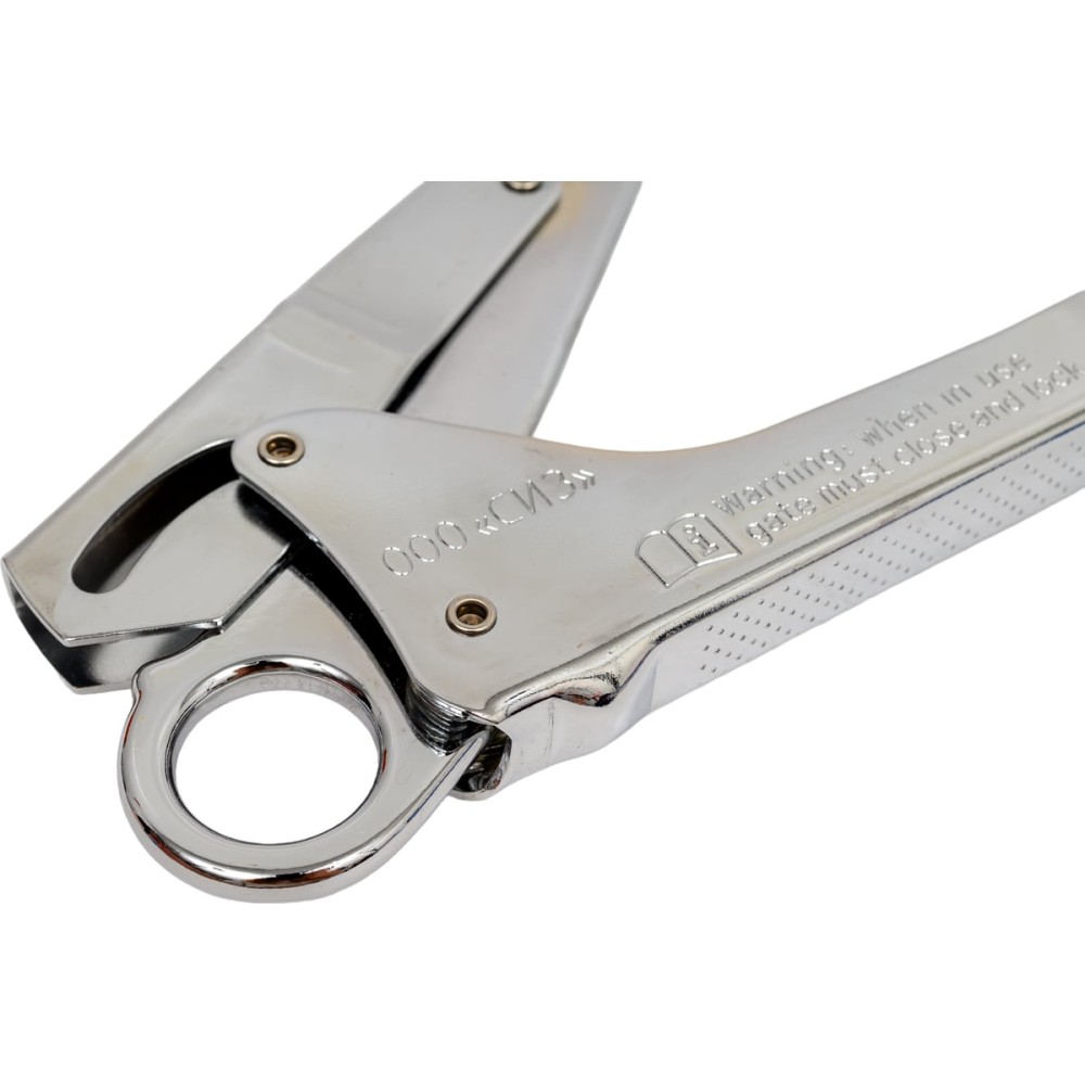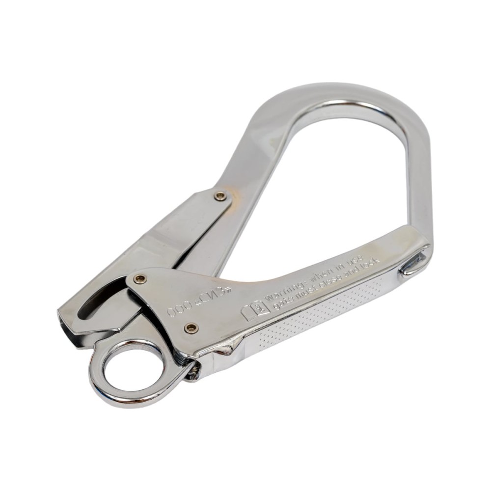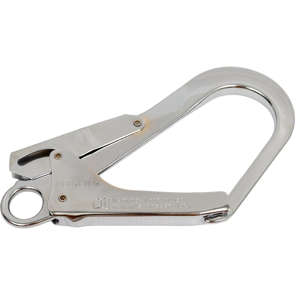 Карабин с автоматической блокировкой защёлки. Применяется при комплектовании стропов для соединения с металлическими конструкциями, тросами, крючьями диаметром не более 55 мм. Используется в изготовлении удерживающих и страховочных стропов СИЗ. Материал: сталь. Раскрытие карабина: 55 мм.