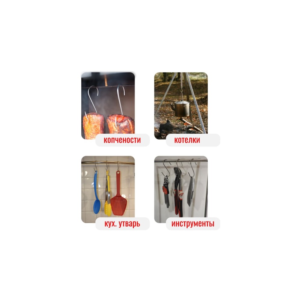 Крючки для мяса из нержавеющей стали российского производства 3 мм*80 мм. В комплект входят 10 крючков. Крюки для мяса изготовлены из пищевой нержавеющей стали. Каждый крюк для мяса с односторонней заточкой. Крючки из нержавейки упакованы в плотную картонную коробку и термоусадочную пленку. Крючок для мяса предназначен для подвешивания мяса, рыбы, колбас, сала, деликатесов и т.п. Крюк для подвешивания используется как в профессиональных, так и бытовых коптильнях, тандырах, духовых шкафах для копчения, вяления, сушки. Крючок для копчения можно мыть в посудомоечных машинах. Крюк для мяса из нержавейки также используется для бытовых целей - подвешивания утвари в хозяйственных помещениях, в туризме - для подвешивания котелка, чайника на огне и т.п. Максимальная нагрузка на крюк для коптильни - до 3 кг.