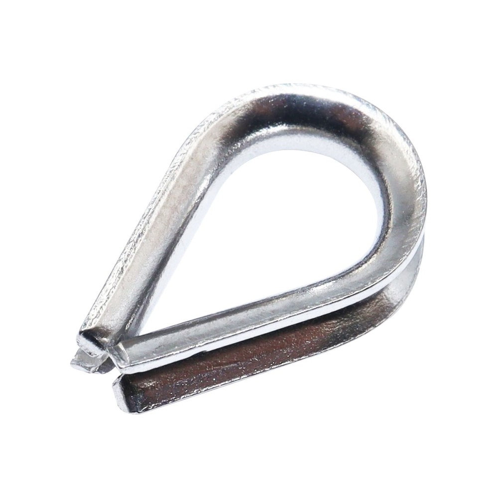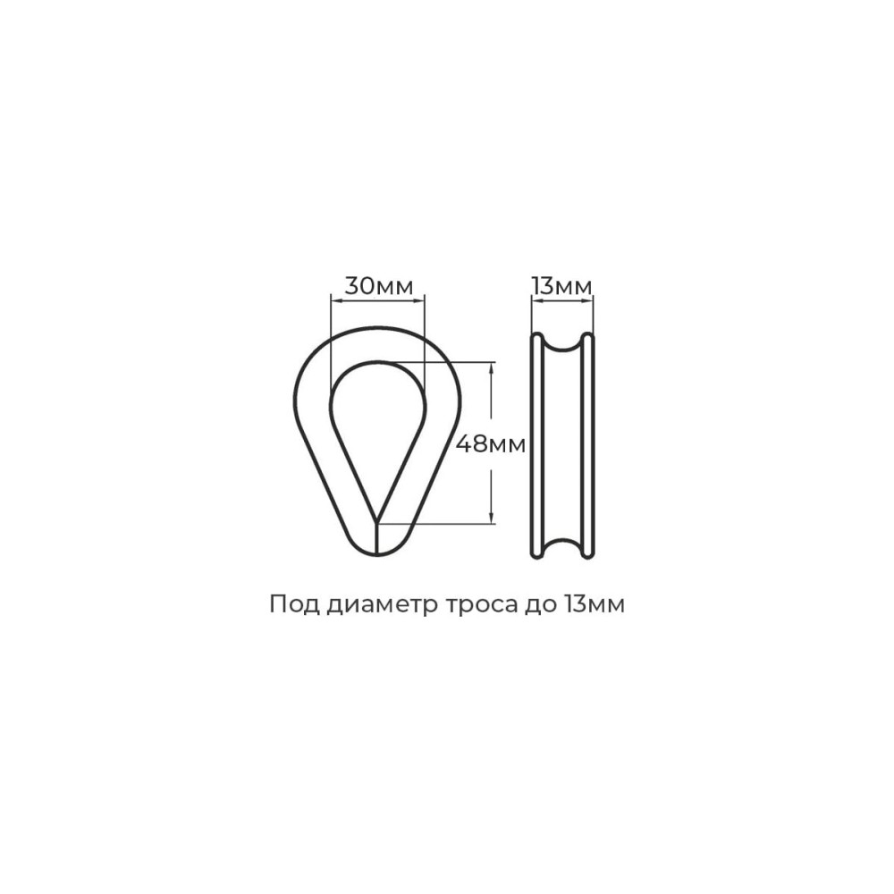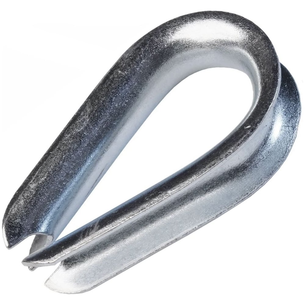 Коуш 13 мм для стальных канатов из оцинкованной стали применяют при изготовлении строп в качестве усилителя петель. Он помогает сохранить волокна материала от быстрого истирания и износа при работе с грузами. Оснащен глубоким желобом с наружной стороны, диаметр которого соответствует диаметру троса. Такая металлическая оправа обеспечивает плавный изгиб петли и продлевает срок службы стропы.