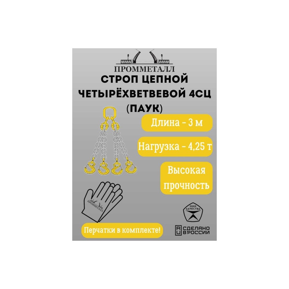 Цепной четырехветвевой строп ПРОММЕТАЛЛ 4СЦ паук 4.25 т 3 м применяется для такелажных работ. Выдерживает груз весом до 4250 кг.