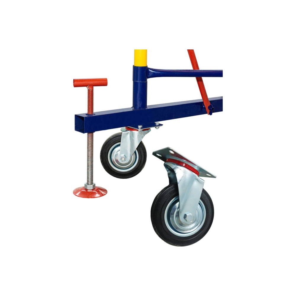 Вышка-тура оснащена большими прорезиненными колесами, которые обеспечивают легкость перемещения по объекту. Колеса снабжены фиксаторами положения, что позволяет тонко подрегулировать высоту вышки и зафиксировать ее от нежелательных перемещений во время работ.
