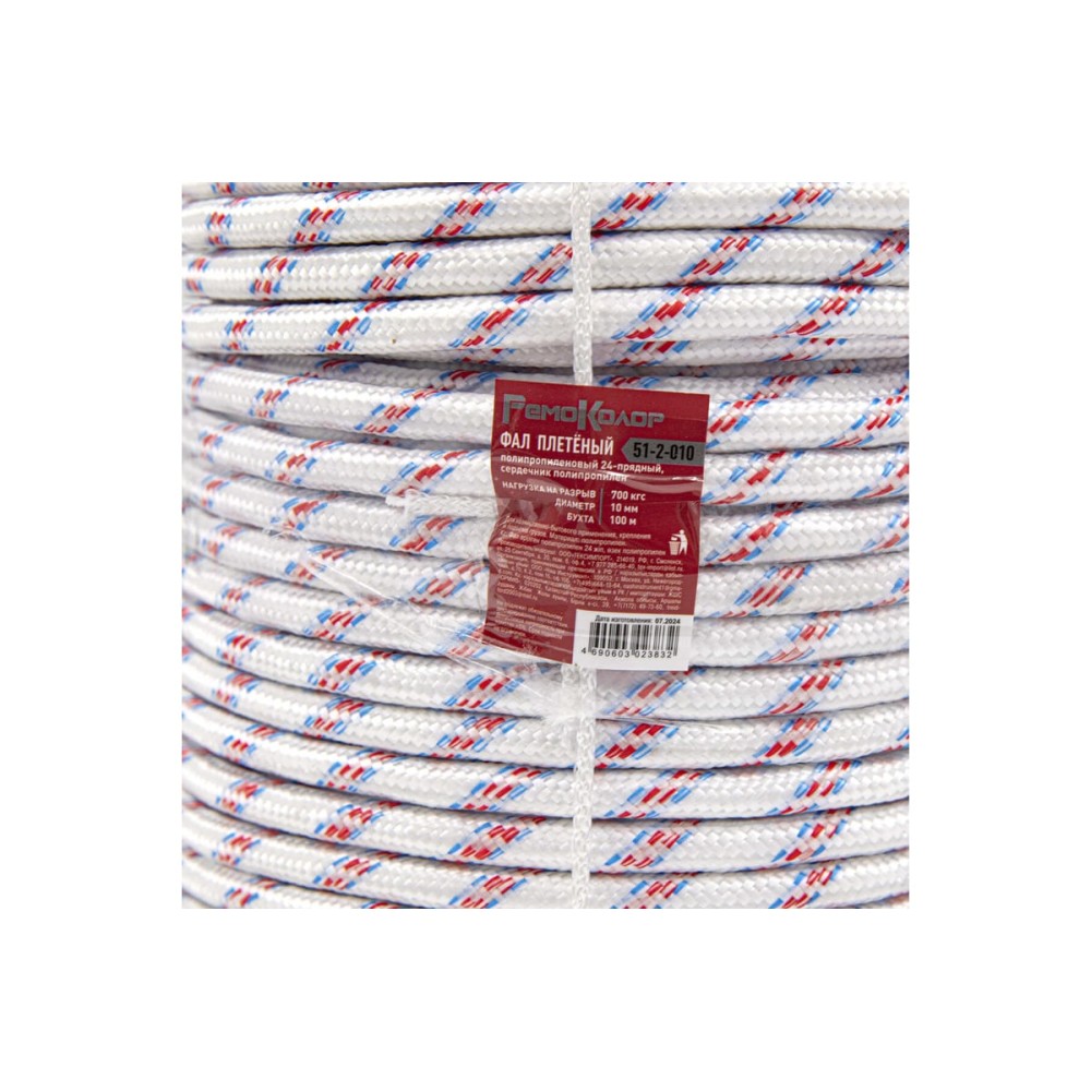 Плетеный полипропиленовый фал с сердечником из полипропилена, 24 пряди, нагрузка 700 кгс, диаметр 10 мм, бухта 100 м.