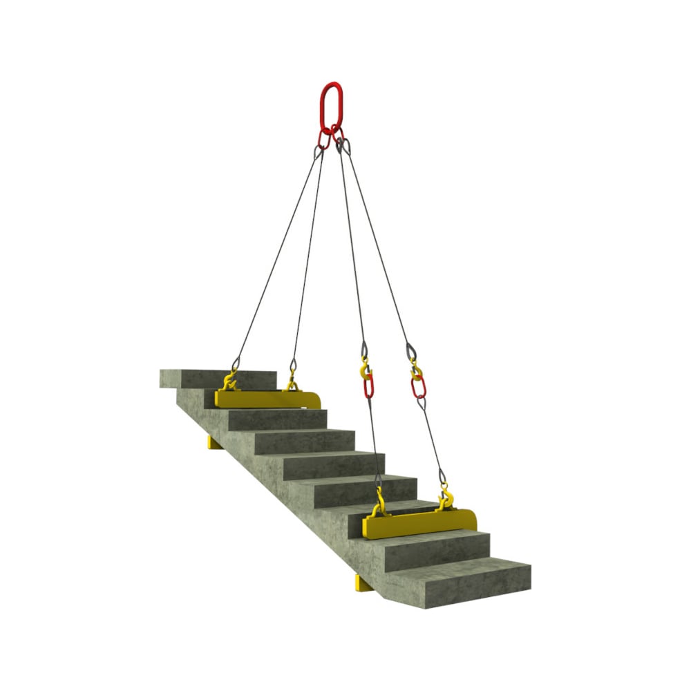 В комплект входят канатные стропы типа 4СК длиной 2,5м и дополнительные стропы 1СК длиной 1,0м, с помощью которых выставляется угол монтажа марша. Конструкция захватов позволяет быстро производить их установку и съем, при этом обеспечивается надлежащий уровень безопасности и надежности фиксации груза. Дополнительно регулировать угол наклона лестничного марша можно устанавливая захваты на ту или иную ступень.